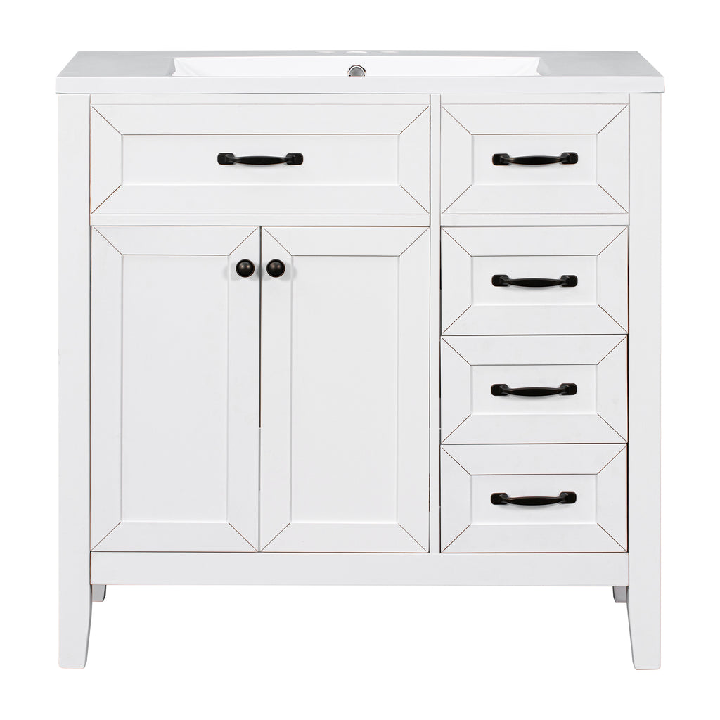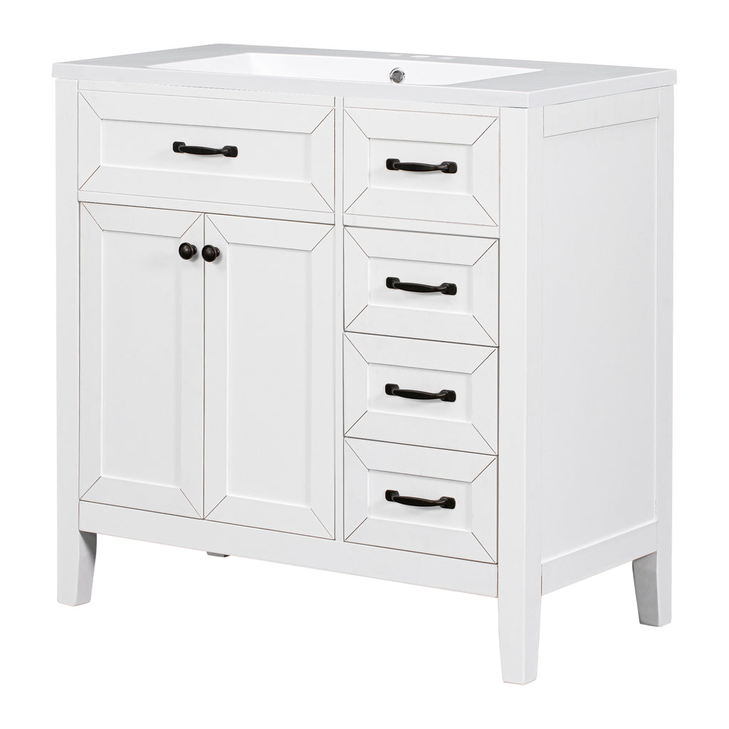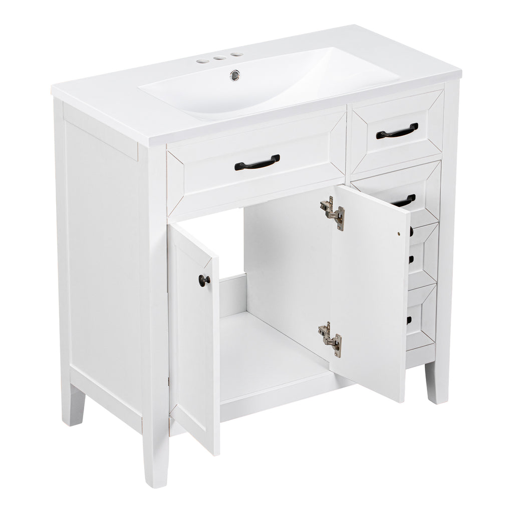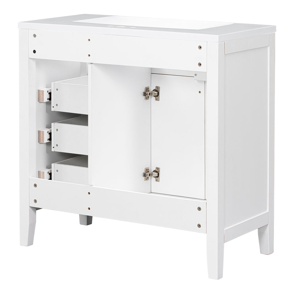 - Stylish 36' Bathroom Vanity: This 36' bathroom vanity is suitable for bathroom in any decoration style. Freestanding white vanity cabinet with black handles complies with your bathroom facilities. The groove design on the door and drawer increases the artistry and aesthetics of the home environment. If you're looking for a simple but stylish bathroom sink vanity, our product will be a great choice to upgrade your bathroom.