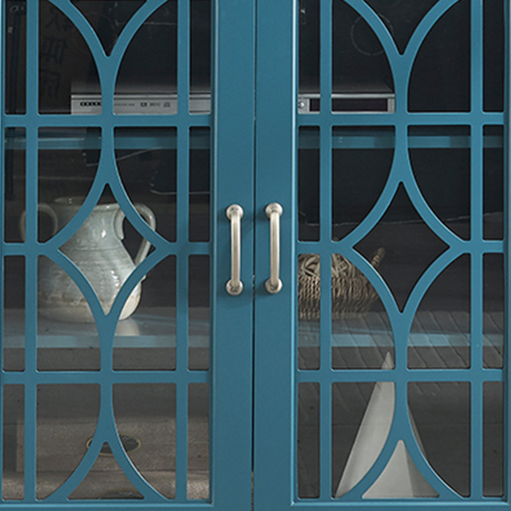 This Multifunctional Storage Buffet TV Cabinet made of high quality MDF wood board with spraying coated in teal blue finish. This cabinet comes with 4 visual tempered clear glass to keep your things out of the dust and easy to identify and reach. The decorative carved wood geometric overlay on cabinet doors adds beauty and enhances the artistic sense of the entire home. No worry about the stability and safety problem, this buffet cabinet is equipped with anti-tip to avoid falling down. Ample desktop and 3 closed cabinets with adjustable shelves provide you with large storage space to keep your kitchen, dining room, living room and other scenarios organized and clean. You can also customize your own storage space by removing or adjusting the movable partition. It is a good piece of furniture combined beauty with practicality.