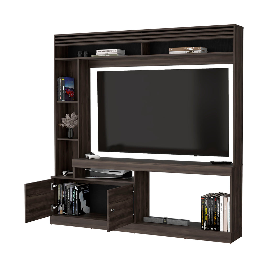 'Entertainment Center with Storage, Shelves, and Open Design This entertainment center combines modern design and functionality, making it a perfect fit for any living room or media space. It features a large open section ideal for a flat-screen TV, surrounded by an array of storage options to keep your space organized and stylish. Spacious TV Compartment: Accommodates large TVs with ample space for a clean, organized look. Multiple Open Shelves: Vertical side shelves and top compartments are perfect for displaying decorative items, books, or media devices. Enclosed Storage with Doors: Two cabinets with swing doors provide hidden storage for cables, remotes. Functional Layout: The combination of open and closed storage allows for flexible organization while maintaining a modern aesthetic. Perfect for modern households looking to maximize storage and display space without compromising on design, this entertainment center is a versatile addition to any home. Materials: Particle board