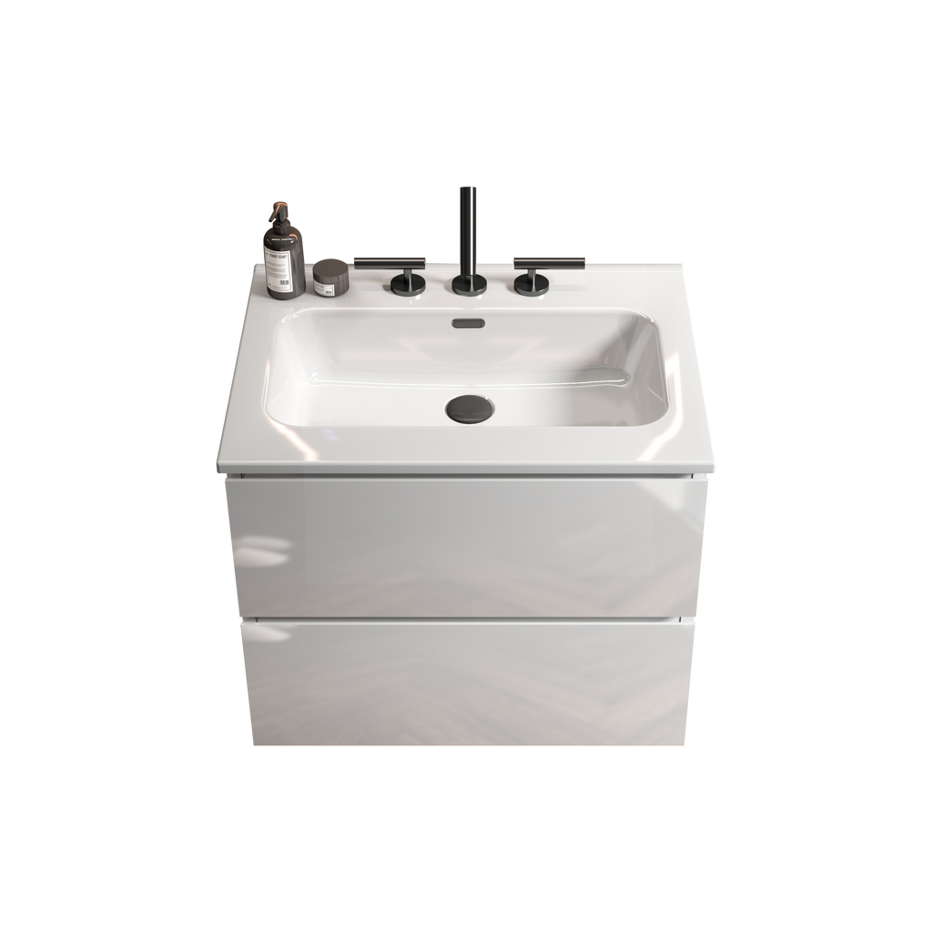 The double drawers maximize the use of space, offering a 20% increase in storage capacity to keep your bathroom essentials organized and within reach. And thanks to the DTC soft-closing silent drawer runners, you can enjoy a serene environment, free from disruptive noises. Featuring an integrated 45° sloping handle-free design, it embraces a minimalist approach to design. The sleek glossy white cabinet enhances the visual appeal and creates a seamless look, adding a touch of modern refinement to your bathroom.