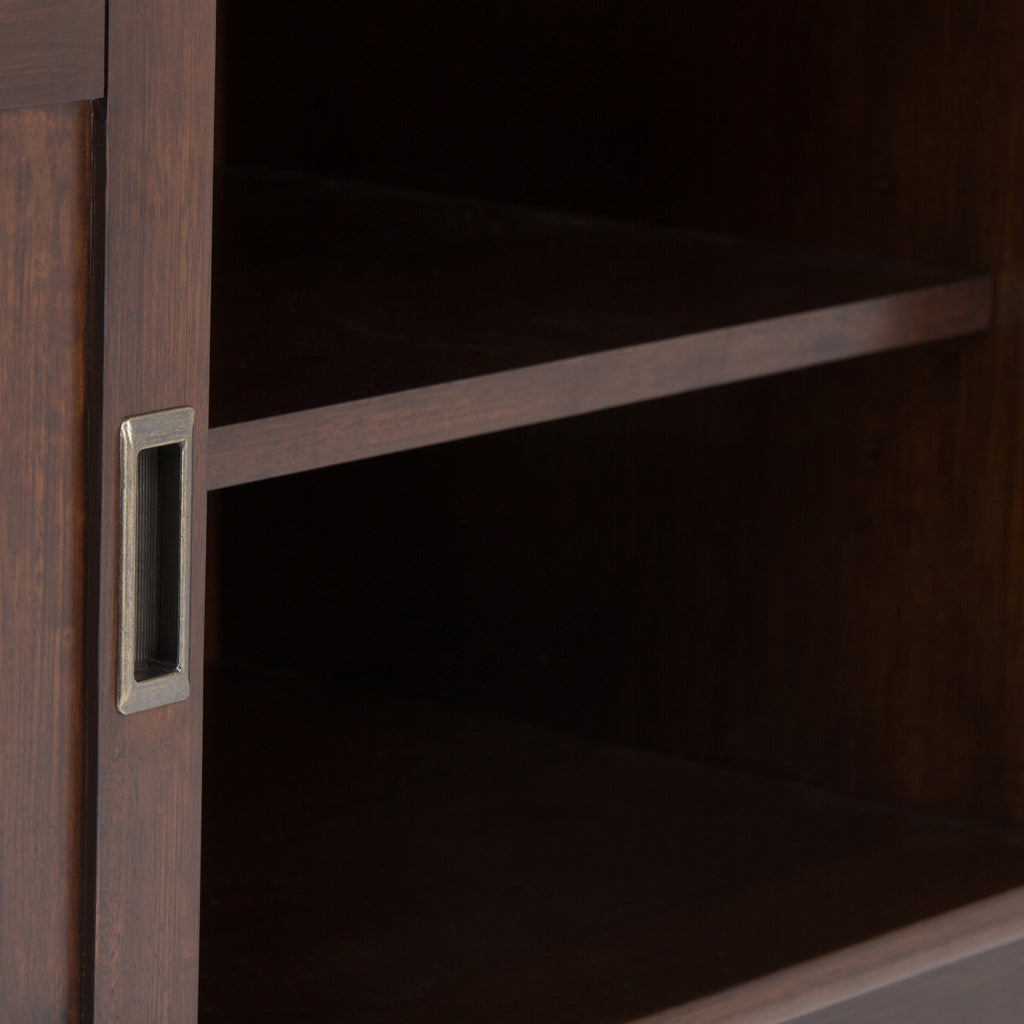 - Features one adjustable shelf in the middle with cable management and two (2) side cabinets with adjustable shelves & recessed door pulls in an Antique Brass hardware finish