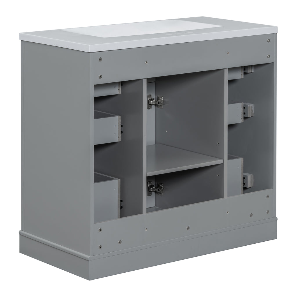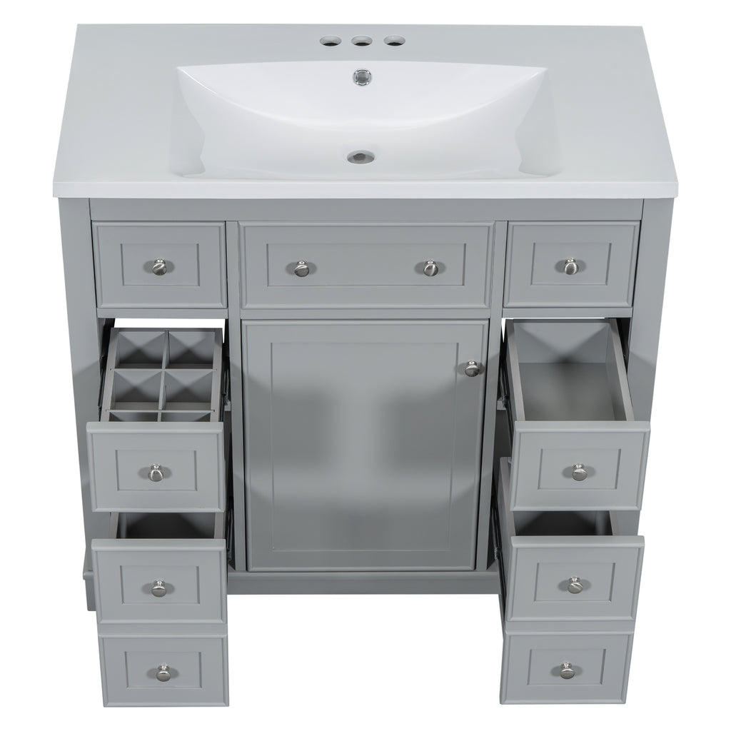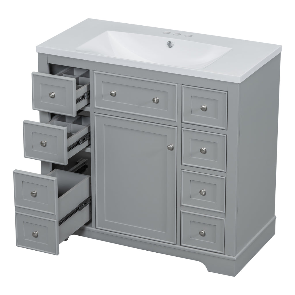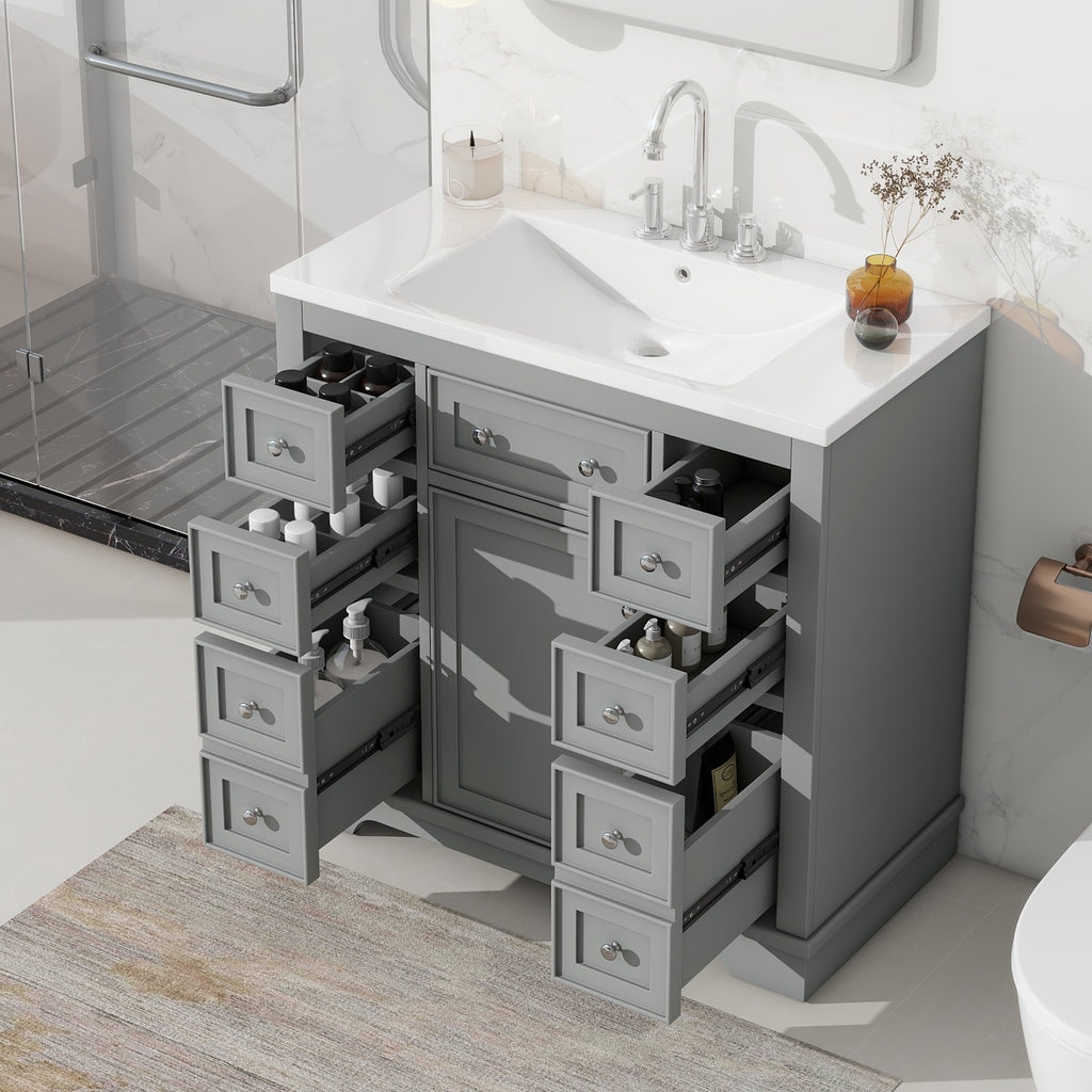 - Vanity with Cabinet & Drawers & Shelf - Considering the humid environment in bathroom, this bathroom vanity has ample enclosed storage spaces: one cabinet with door, three drawers with slide rail each side (the top middle one drawer is for decoration use only), and adjustable shelf in the cabinet. You can put soaps, towels, shampoos, tissue paper and other bathroom essentials in it so to keep them away from dust.