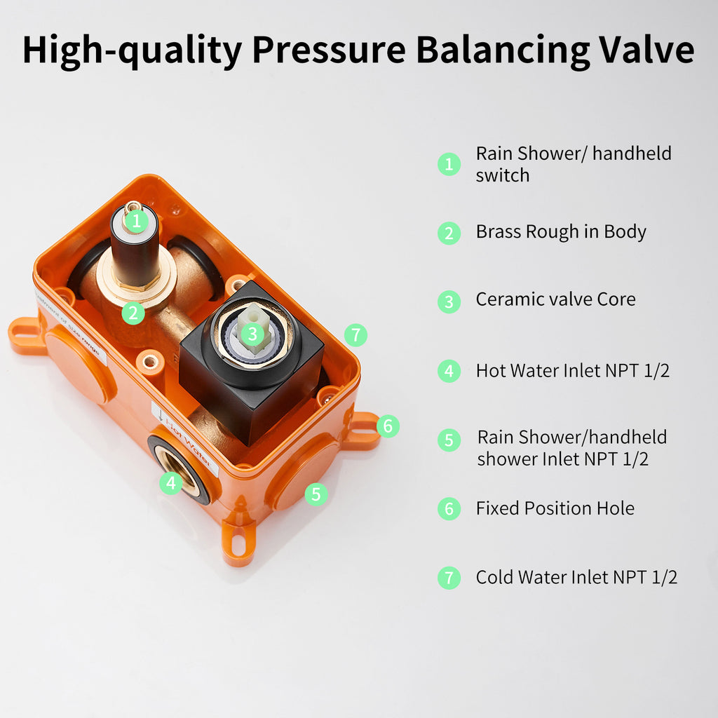 Quality Promise: All-metal sturdy construction. Mixing valve made of solid brass with rust-free, long-life characteristics. 304 Stainless Steel Rain Shower Head with silicone nozzles allows you to wipe away mineral deposits with the swipe of a finger.