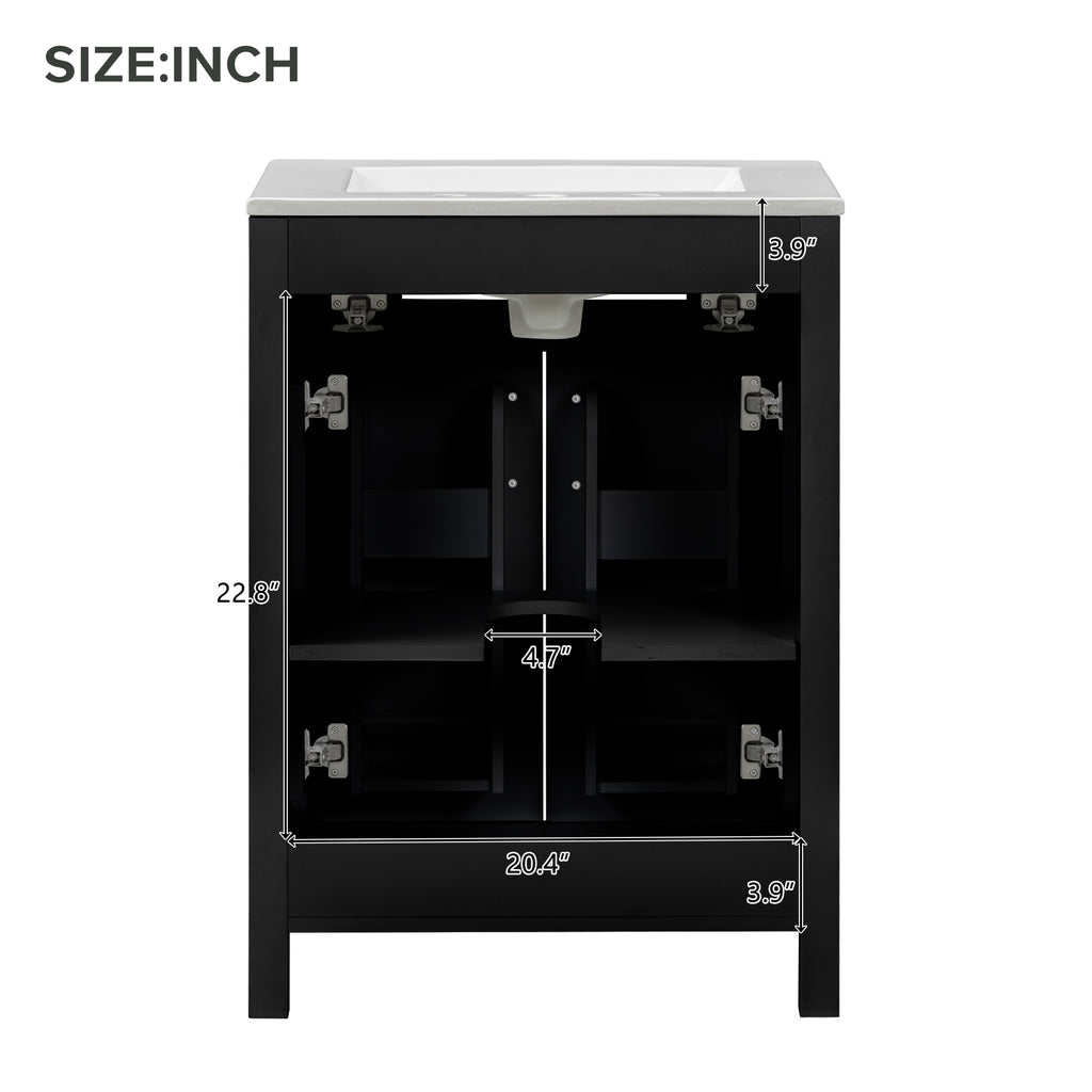 This vanity featuring 2 soft close doors. The doors open to reveal dual-tier shelving, offering convenient storage for items like toothbrushes and toothpaste. The interior of the cabinet is equipped with a U-shaped adjustable shelf, allowing you to customize the space according to your needs.