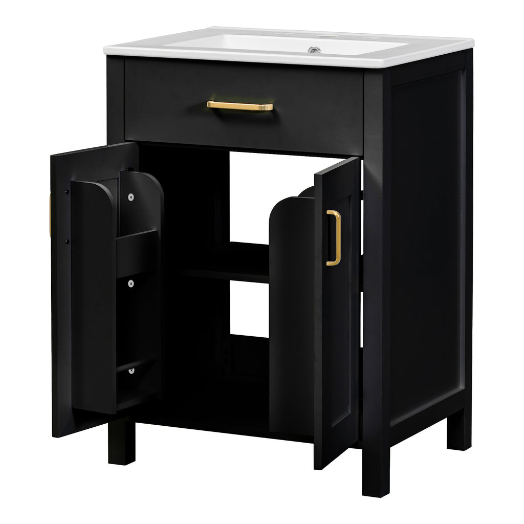 The golden handles elevate the aesthetic appeal, creating a luxurious atmosphere in your bathroom. The ceramic sink not only enhances the vanity's style but also includes an overflow hole for added practicality in your daily routine.