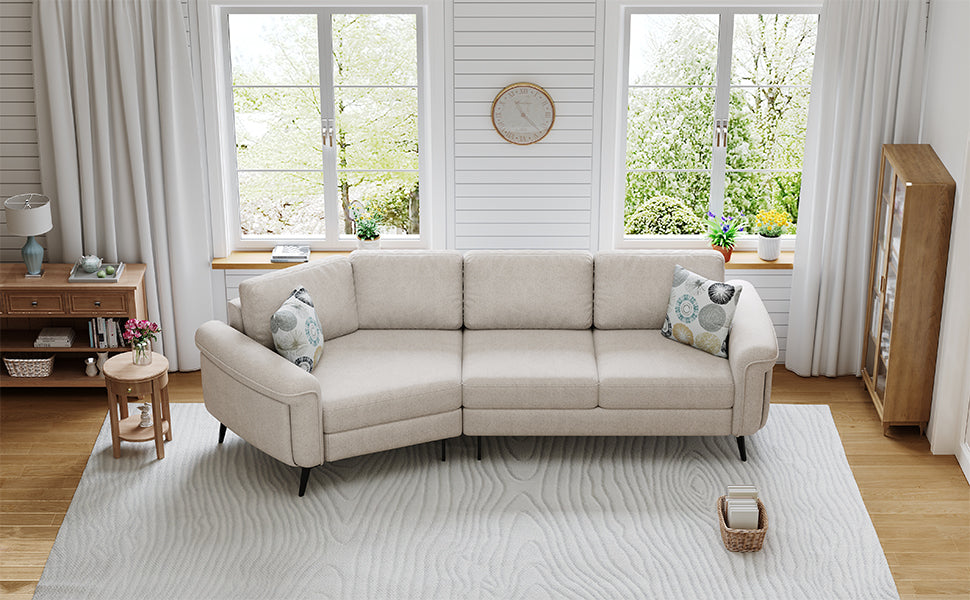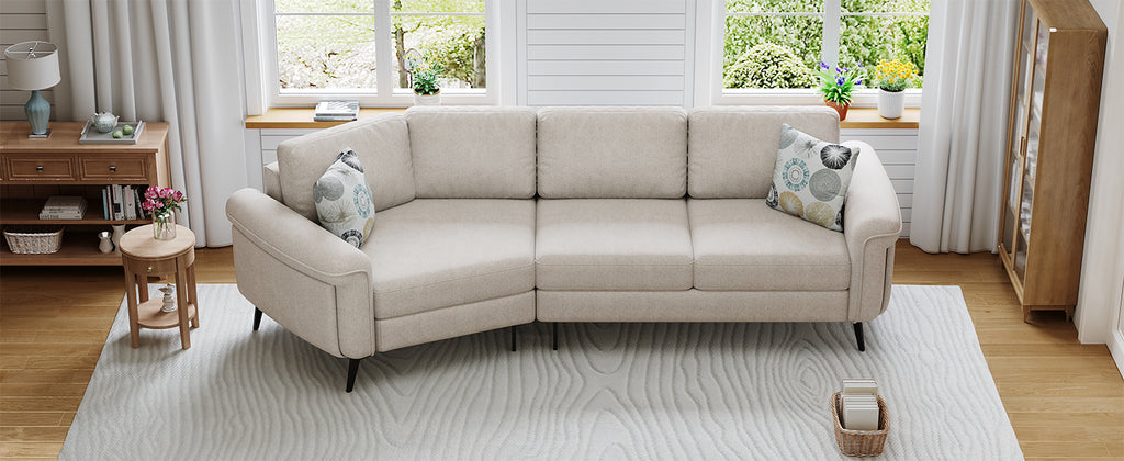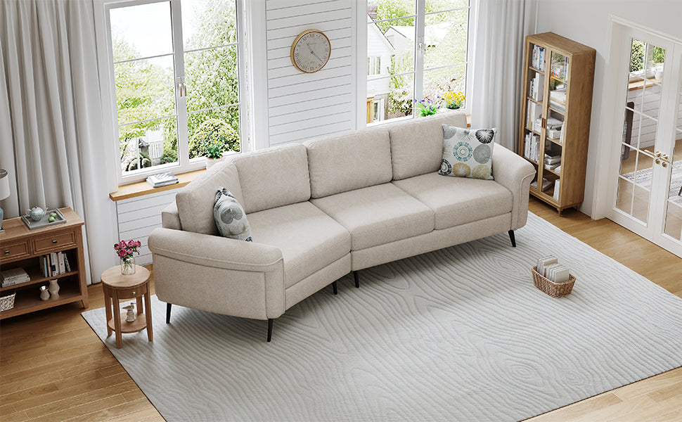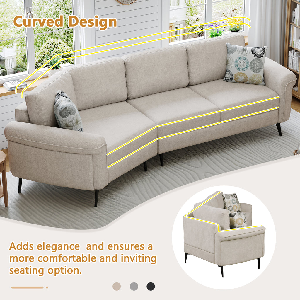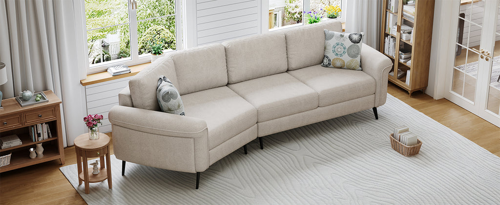 - Elegant Design - The three-seat sofa features a sleek, curved design that enhances both its visual appeal and comfort. The gentle arc shape promotes a more relaxed seating experience by allowing for a natural flow of movement and providing better support for the body. This modern, ergonomic design not only adds elegance to any room but also ensures a more comfortable and inviting seating option.