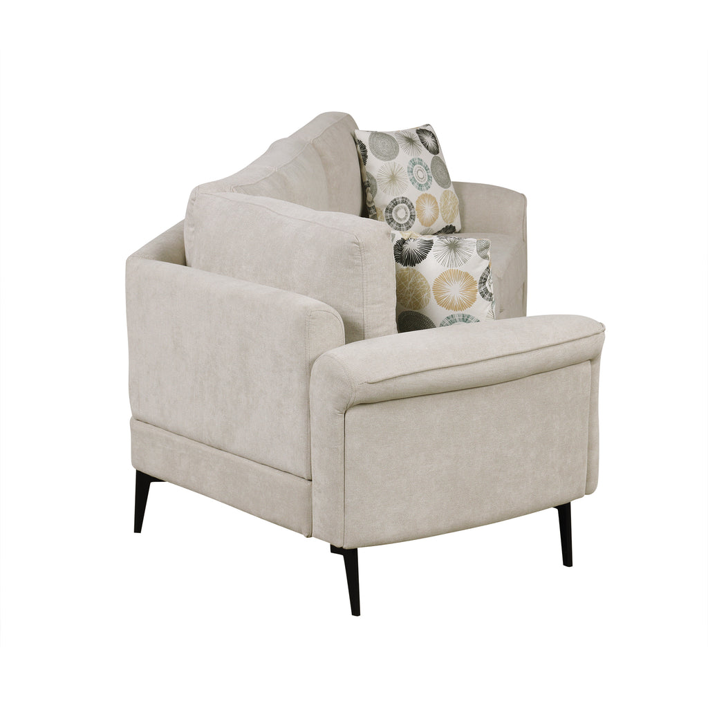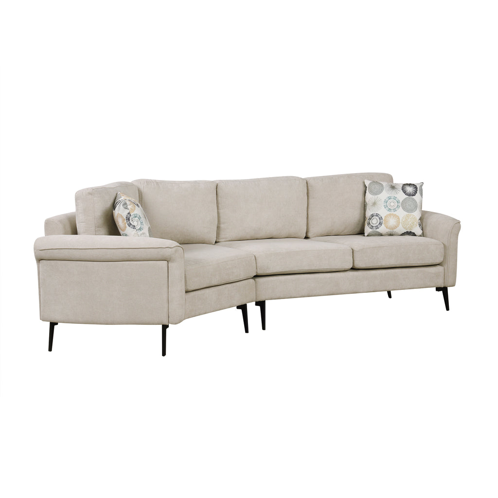 This three-seat sofa offers a perfect combination of style, comfort, and functionality. Its ergonomic armrests are thoughtfully designed with a gentle curve to match the natural contours of the body, ensuring superior support and relaxation. The sleek, curved design adds a touch of elegance and promotes a more relaxed seating posture. Durable metal legs provide sturdy support while elevating the sofa for a light and spacious feel, complementing its modern aesthetic. Additionally, the sofa comes with two removable patterned pillows that enhance its visual appeal and offer practical versatility, as they are easy to clean or swap out for a refreshed look. This sofa is an ideal choice for those seeking comfort, durability, and timeless elegance in their living space.