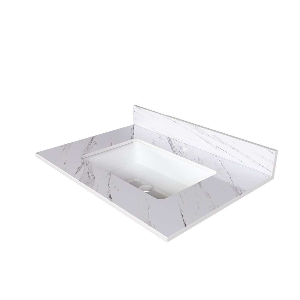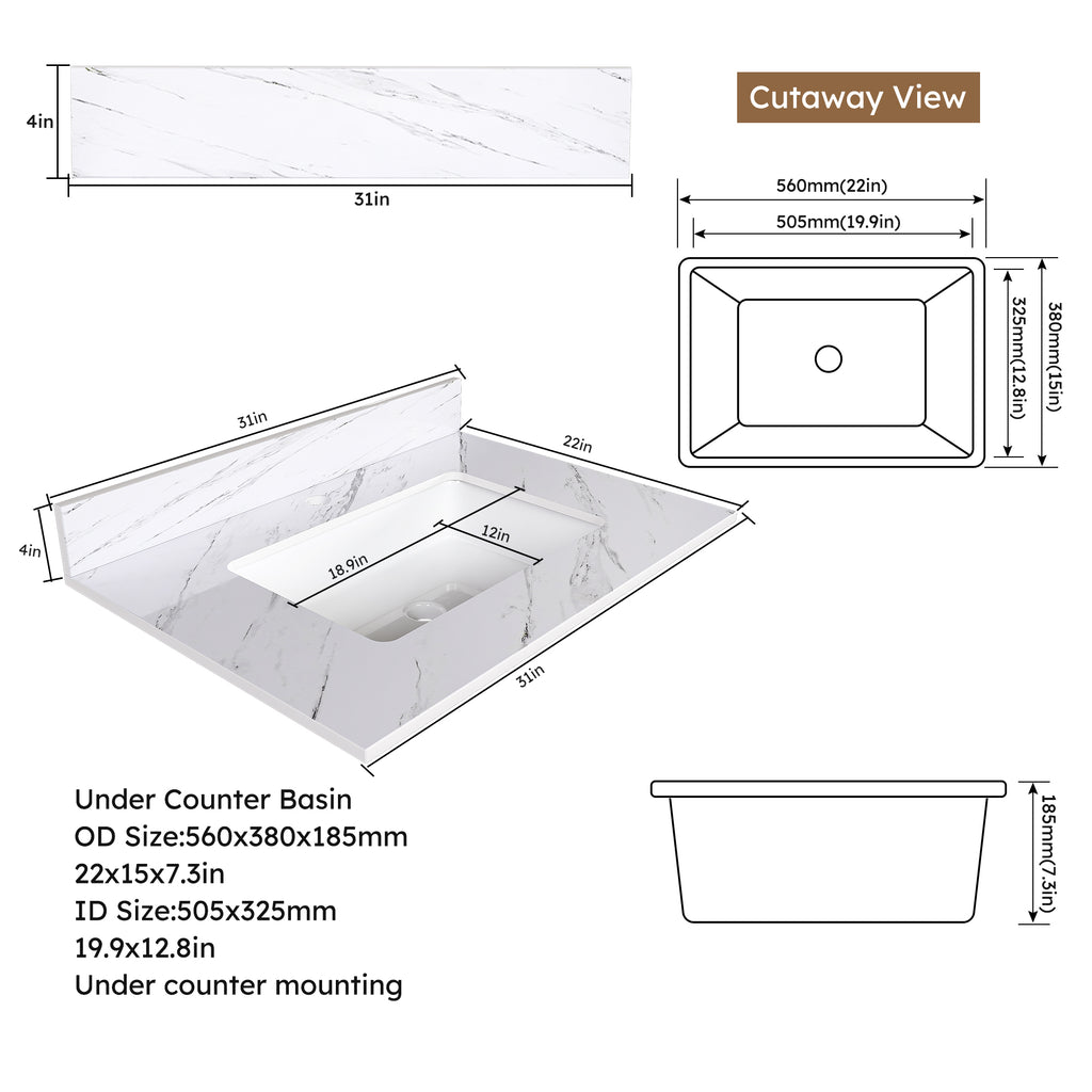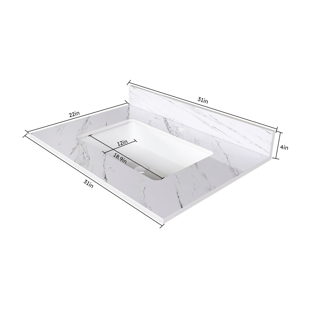 - Dimensions: vanity top measures 31 inches wide by 22 inches deep, 4-inch high backsplash ,to fit perfectly into most standard 30' W x 21' D size vanity cabinets.