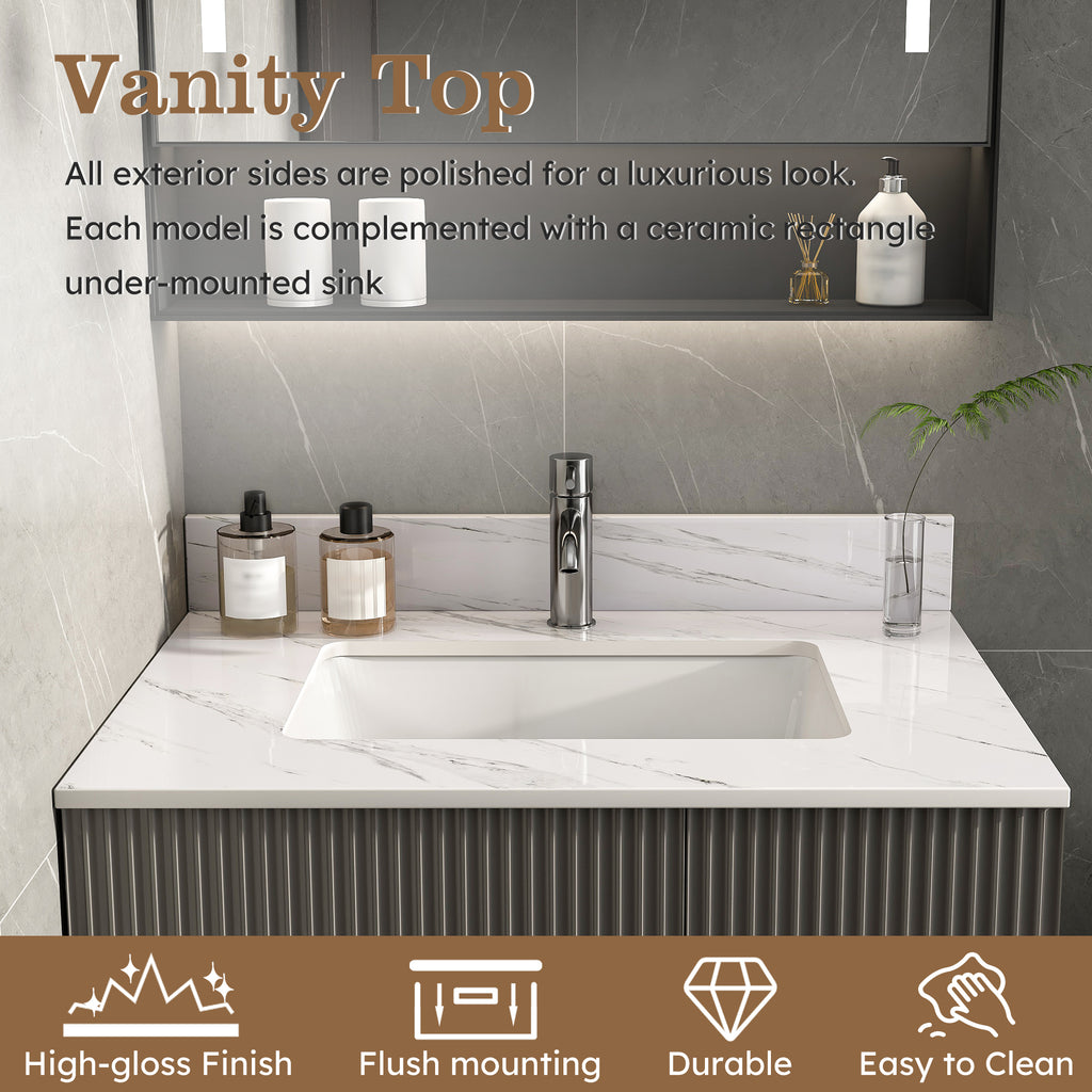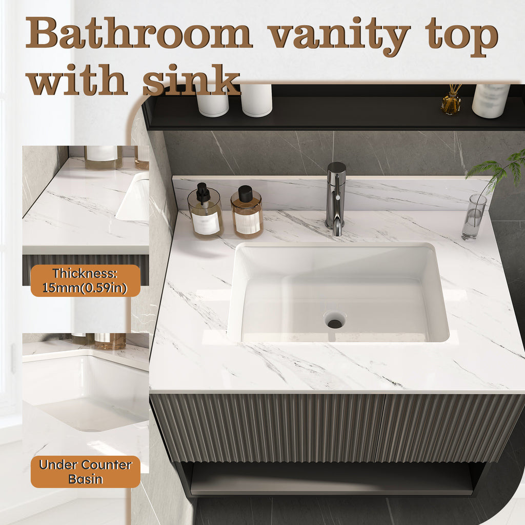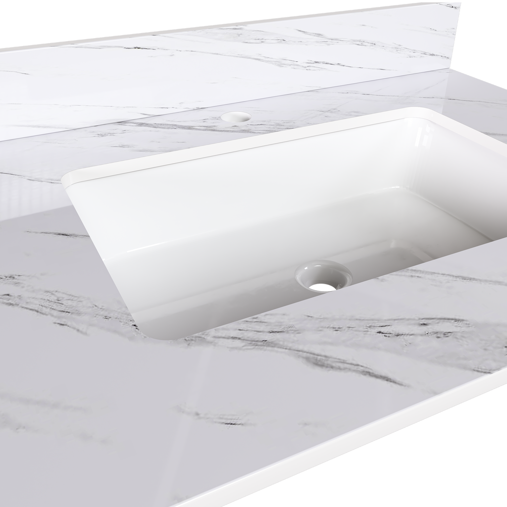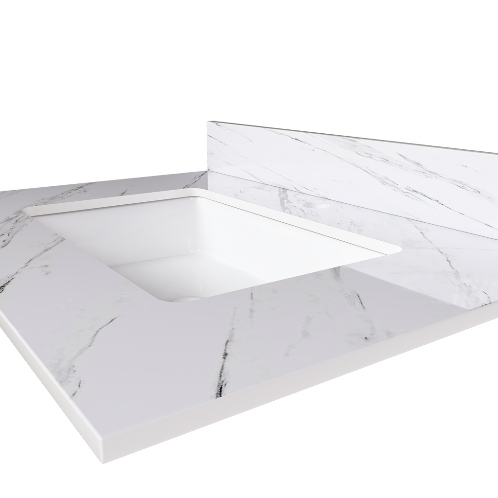- Package Includes: vanity top with assembled rectangular ceramic sinks, 4' high backsplash. Besides, an extremely solid package - Reinforced packaging making sure a safe delivery. (Attention: Cabinet and faucet NOT INCLUDED).