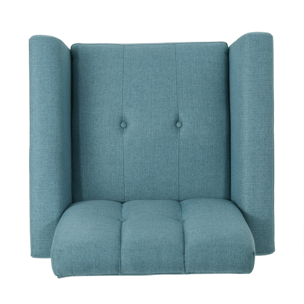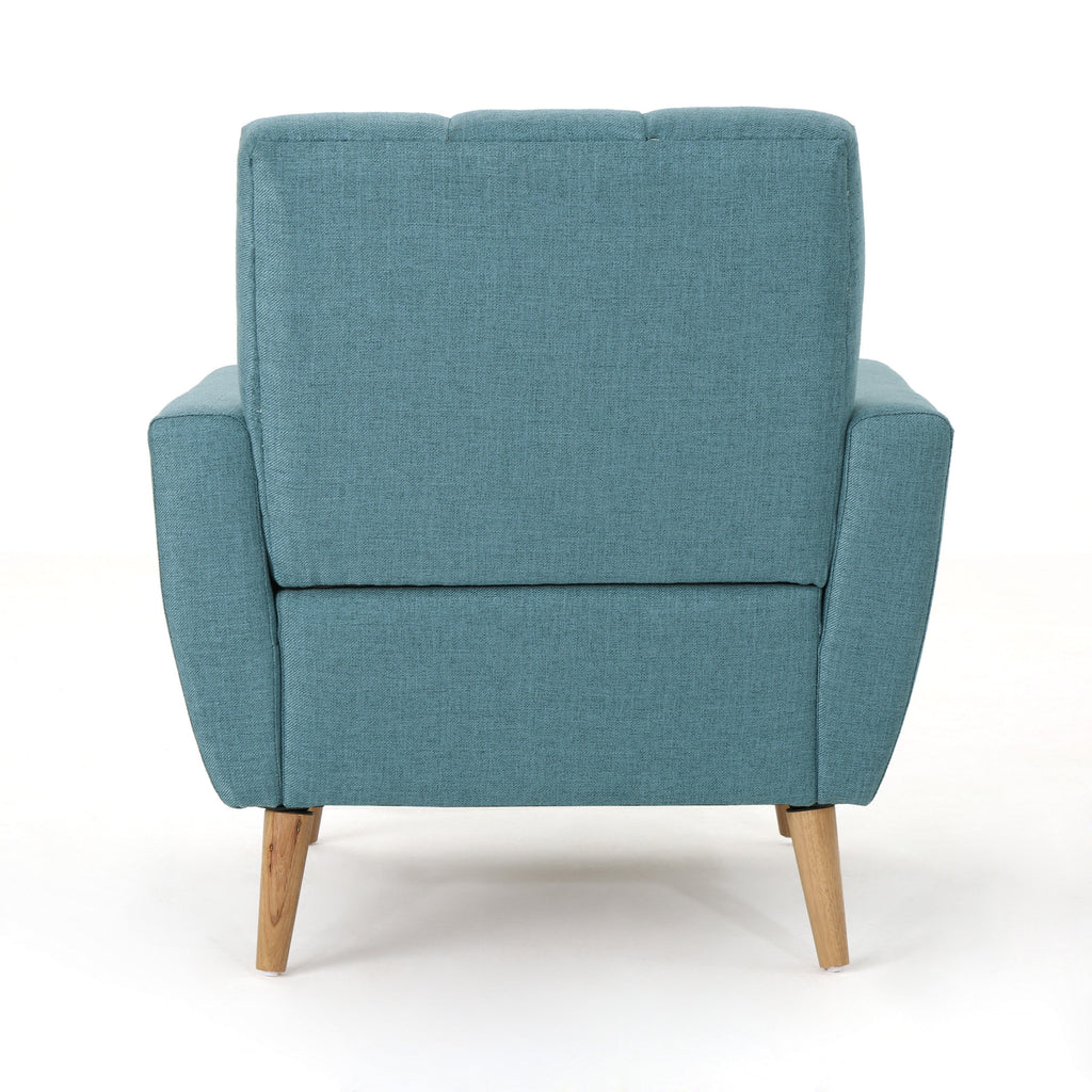 - This mid century club chair is the perfect addition to any living room. Featuring a buttoned and slightly tufted back to allow for extra padding and cushioning, this club chair is both stylish and comfortable. Set upon rubberwood legs, this club chair will complement any decor, regardless of if is mid century or not.