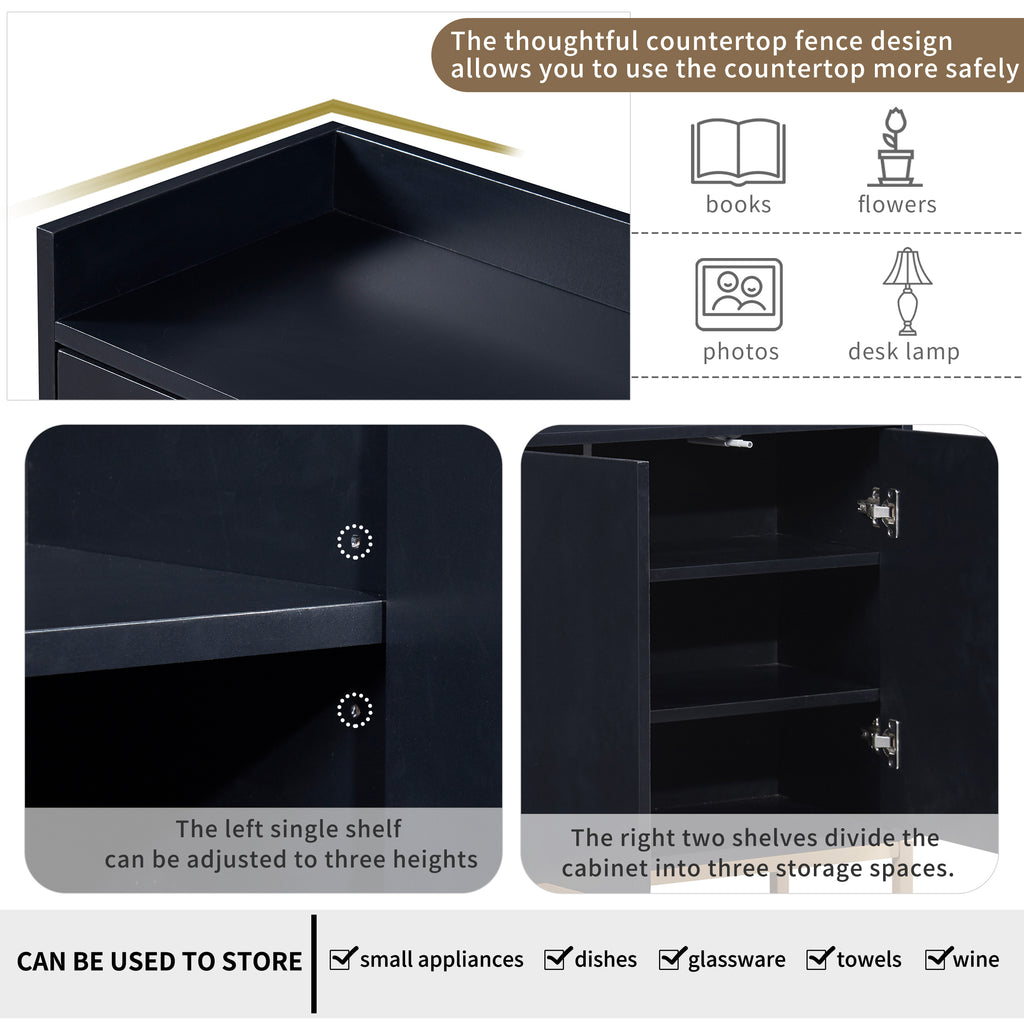 • The thoughtful countertop fence design allows you to use the countertop more safely. The internal three shelves provide enough storage space, the left single shelf can be adjusted to three heights as well or users can remove it if need. And the right two shelves divide the cabinet into three storage spaces. can be used to store small appliances, dishes, glassware, towels, wine, and anything else you have in mind.