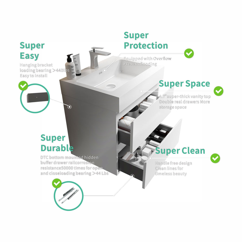 Elevate your bathroom aesthetics with Alice, the epitome of timeless elegance. This white modern bathroom vanity seamlessly blends style and functionality to transform your space into a sanctuary of luxury. With its pristine white basin and cabinet, Alice exudes a sense of purity and sophistication. The white color palette creates a clean and airy atmosphere, making your bathroom feel bright and inviting.