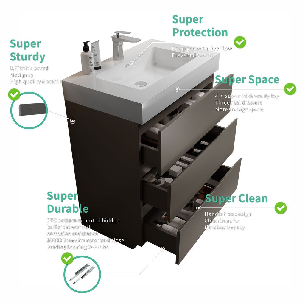 Step into a world of contemporary sophistication with Alice, the single freestanding bathroom vanity that will transform your bathroom into a luxurious oasis. With its sleek gray finish and glossy white engineered stone basin, Alice exudes a timeless charm that effortlessly blends style and functionality.