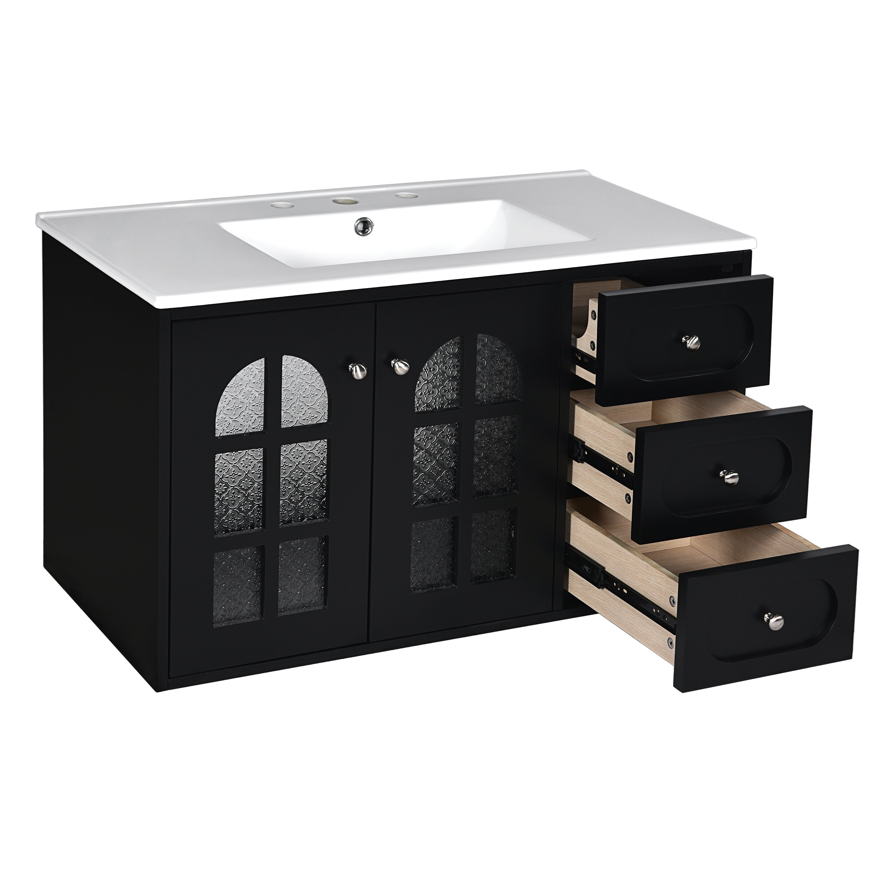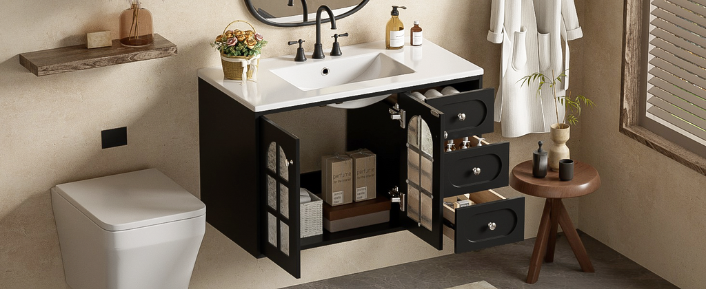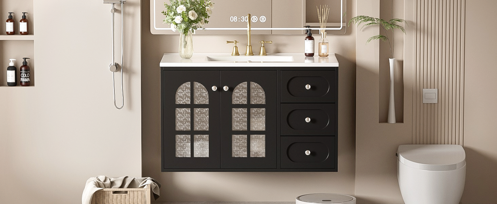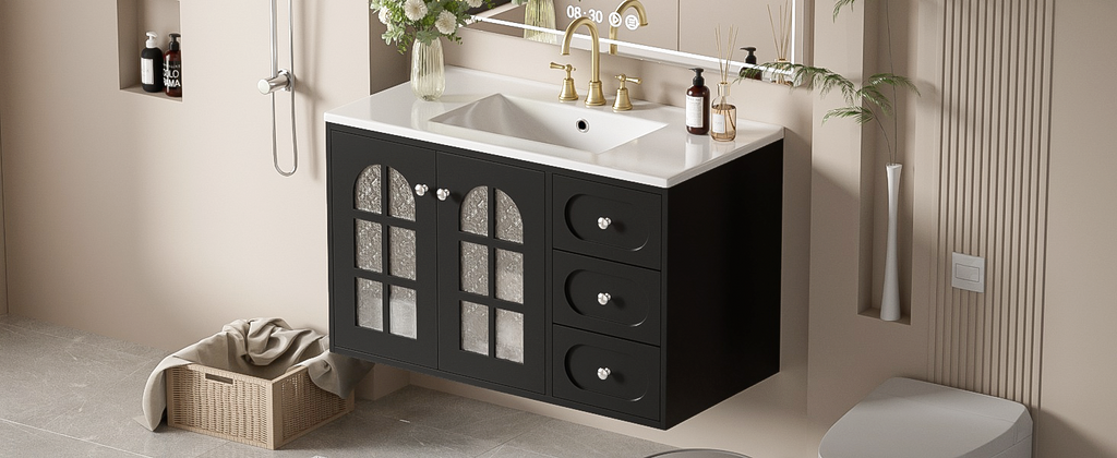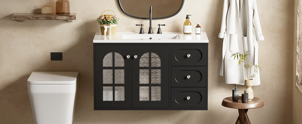 This 36-inch black wall-mounted bathroom cabinet uses exquisite MDF panels and a stable solid wood frame, perfectly blending modern and classic design. The elegant black appearance is simple and atmospheric, which not only matches various bathroom styles freely, but also adds a sense of fashion to the space. The cabinet door is cleverly designed and equipped with a translucent patterned glass door, which not only effectively protects privacy, but also allows light to shine through the glass into the bathroom, adding a sense of warmth and transparency.