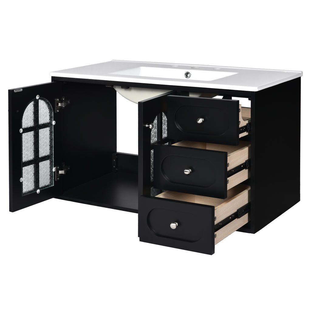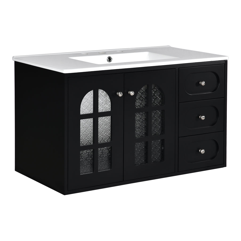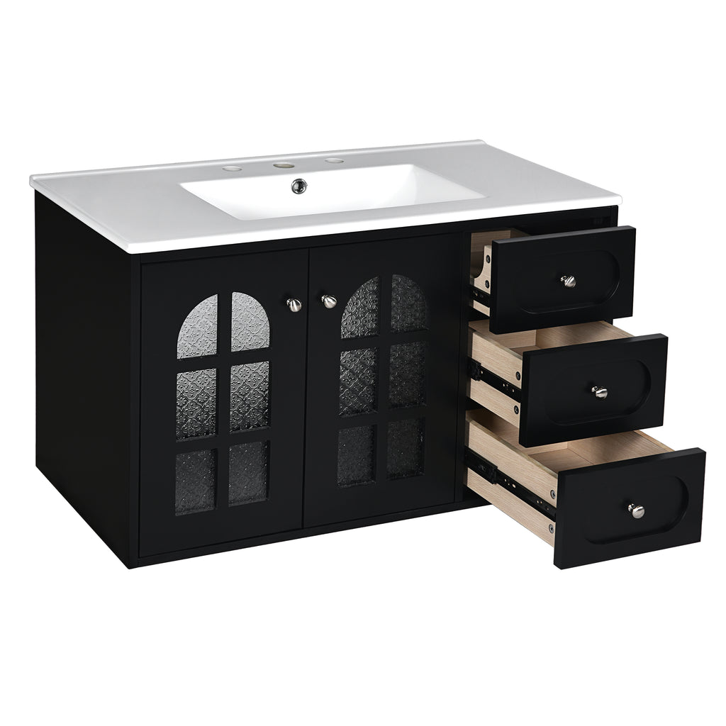 36 Inch Floating Bathroom Vanity with Cermiac Sink, Wall Mounted Bathroom Cabinet with 3 Drawers