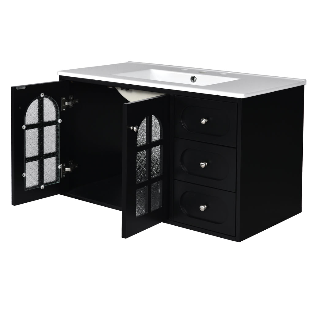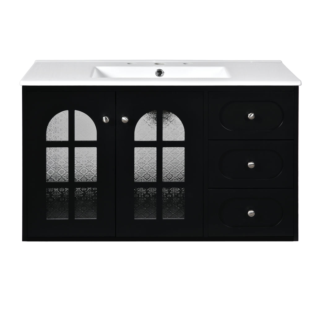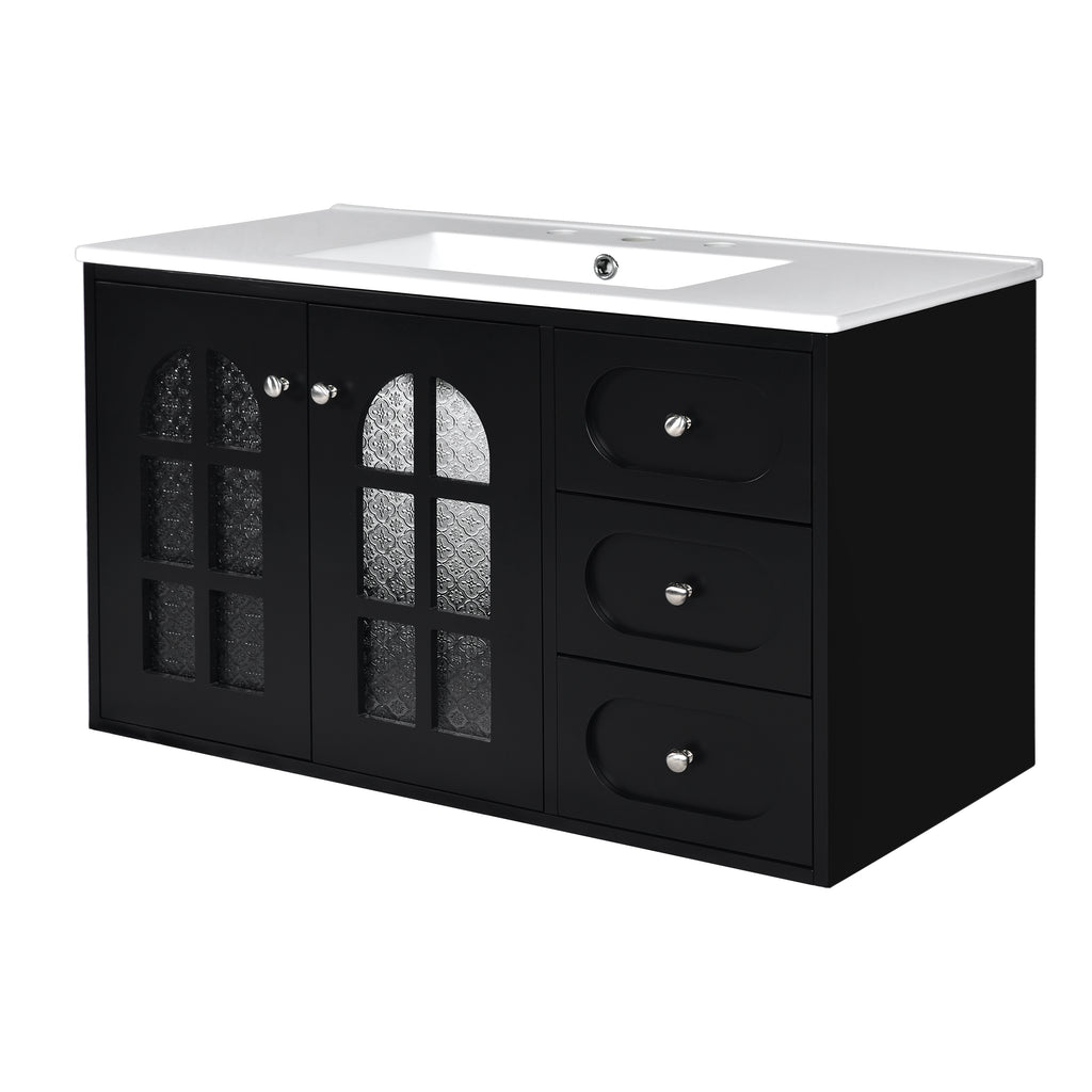 36 Inch Floating Bathroom Vanity with Cermiac Sink, Wall Mounted Bathroom Cabinet with 3 Drawers