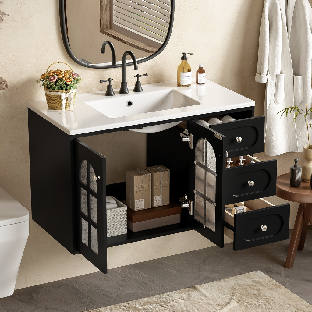 - [Ample Storage Space] This floating sink bathroom vanity offers ample storage space with 3 drawers and 1 large storage cabinet, keeping your toiletries and other essentials organized and within reach.