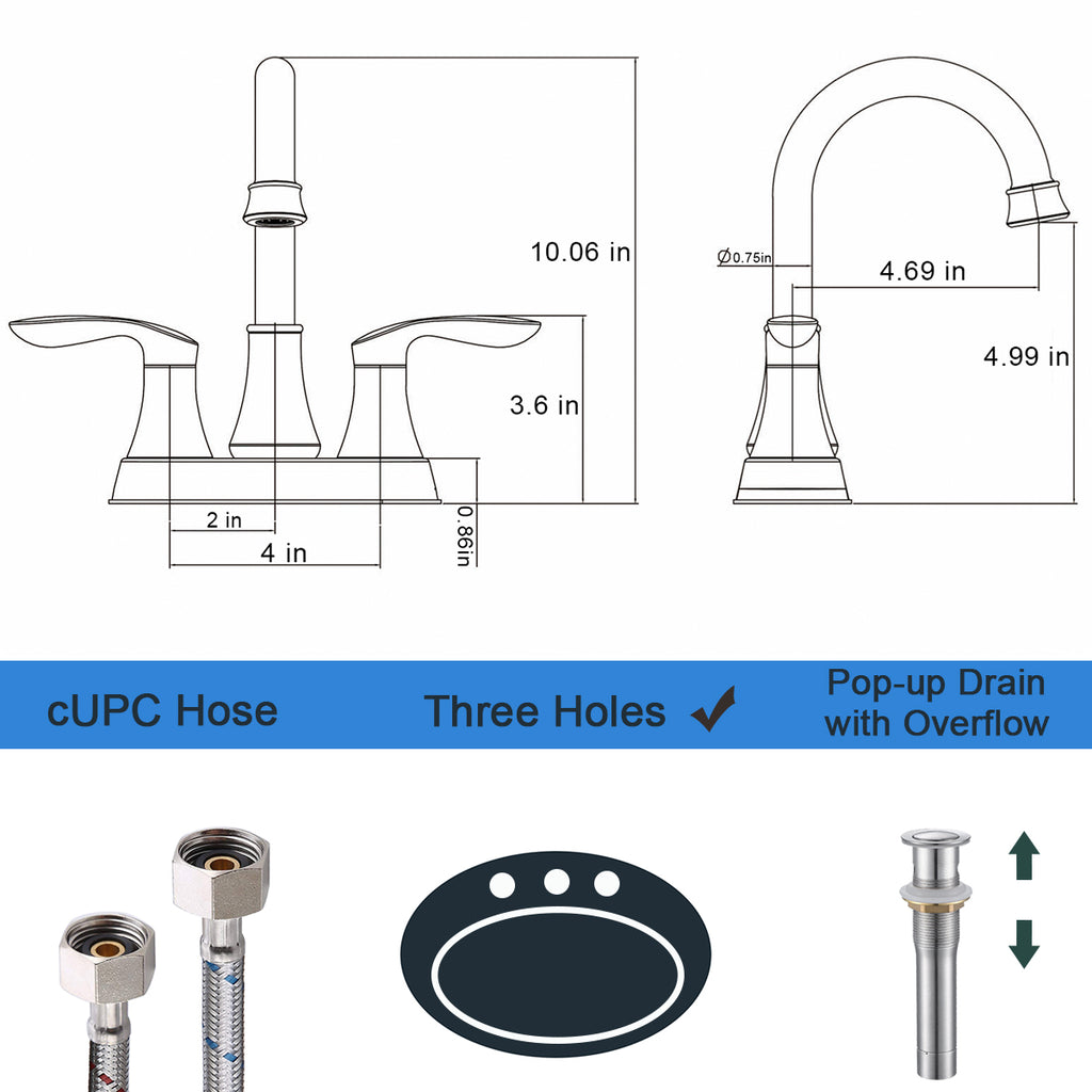 - 1. OVERALL MEASUREMENTS: Height:10.06'; Spout Height:4.99'; Spout Reach:4.69'. Exquisite faucet for bathroom sink, anti-scratch, resist rust, corrosion and tarnish, no water spot and finger print.