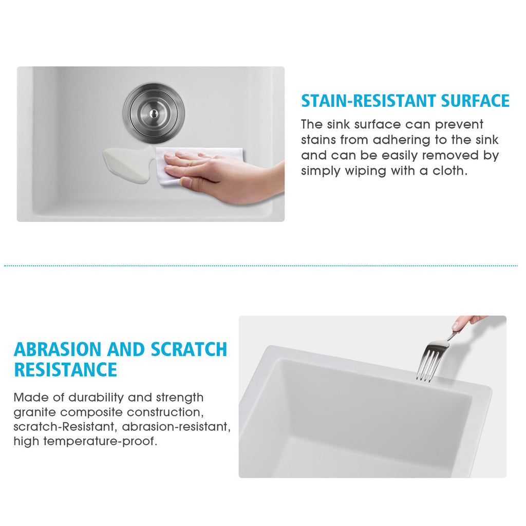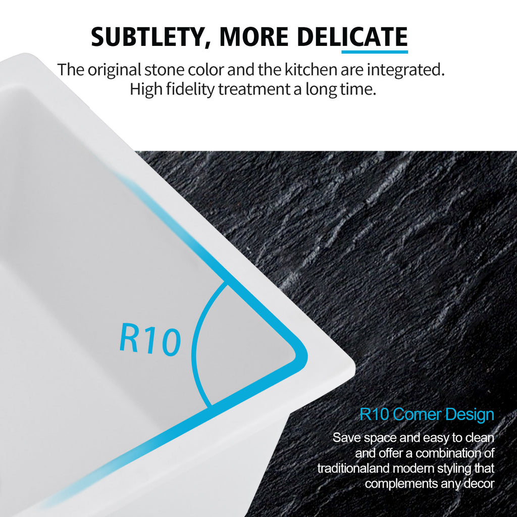 We are dedicated to creating elegant, stylish, and high-quality kitchen sinks. This quartz sink is crafted from 80% natural quartz and 20% proprietary resin through high-temperature processing. Advanced proprietary manufacturing techniques ensure uniform material distribution, providing unparalleled resistance to heat impact and damage from dropped items. With no worry about wear and tear, it offers the best experience for your kitchen living.