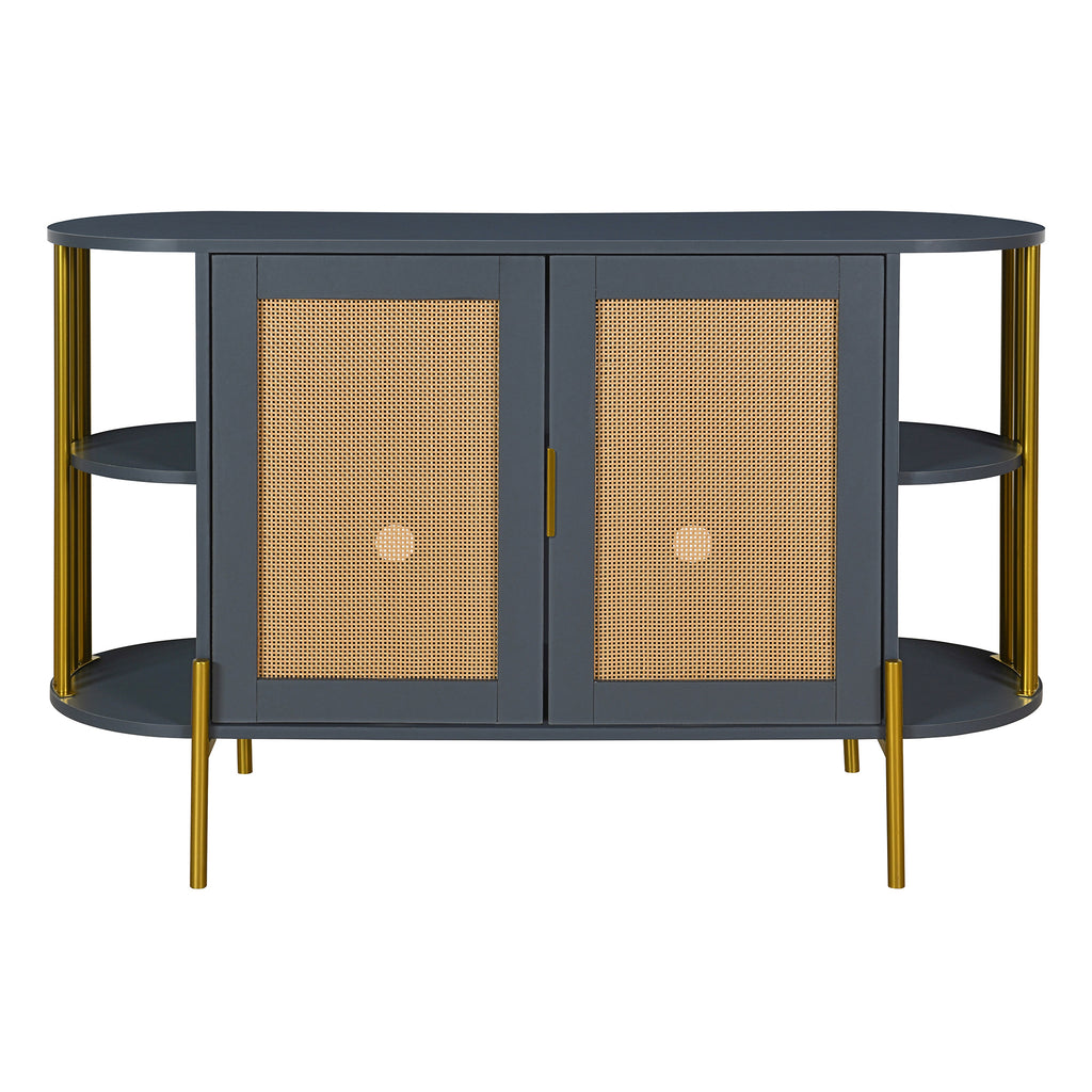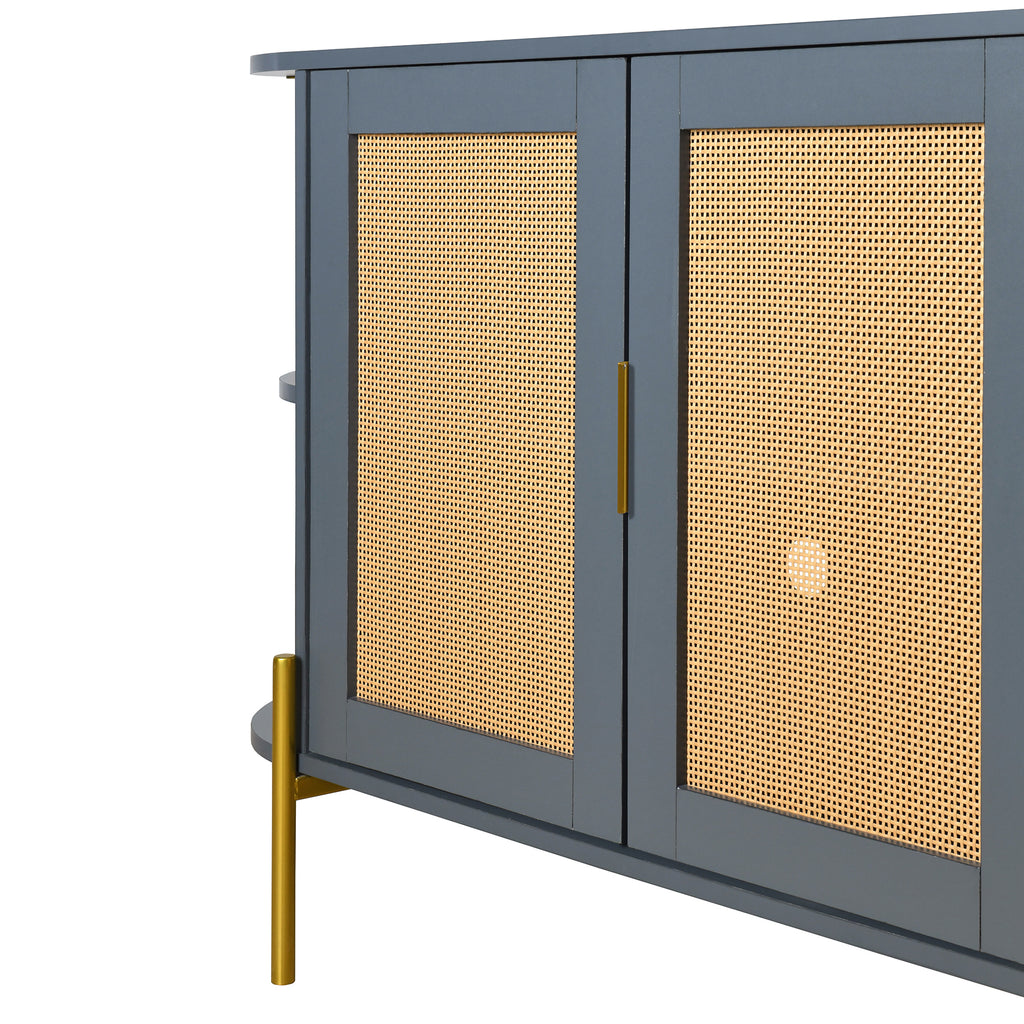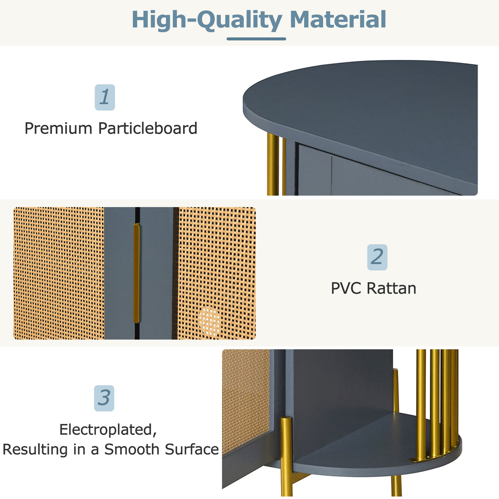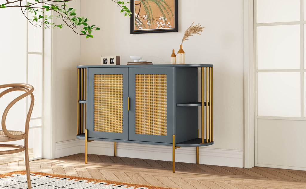 Crafted from premium particleboard, It ensures sturdiness. The two doors feature finely crafted rattan, guaranteeing long-lasting use. The gold handles, legs, and side supports are all power coating, resulting in a smooth surface that not only adds a touch of luxury but also enhances durability and stability. The gold vertical bars that support the shelves add a touch of sophistication and reinforce the luxurious feel.
