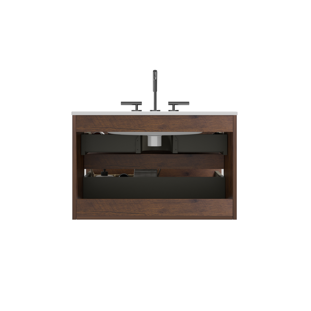The double drawers maximize the use of space, offering a 20% increase in storage capacity to keep your bathroom essentials organized and within reach. And thanks to the DTC soft-closing silent drawer runners, you can enjoy a serene environment, free from disruptive noises. Featuring an integrated 45° sloping handle-free design, it embraces a minimalist approach to design. The sleek Walnut cabinet enhances the visual appeal and creates a seamless look, adding a touch of modern refinement to your bathroom.