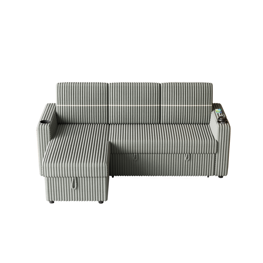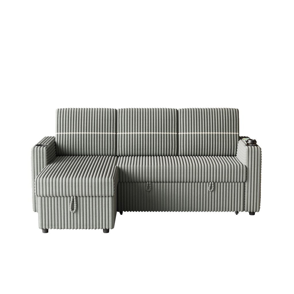- 3 Seater Sleeper Sofa with Storage Chaise, Square Handrail With two cup-holder and USB charge port, Pull Out Couch for Living Room