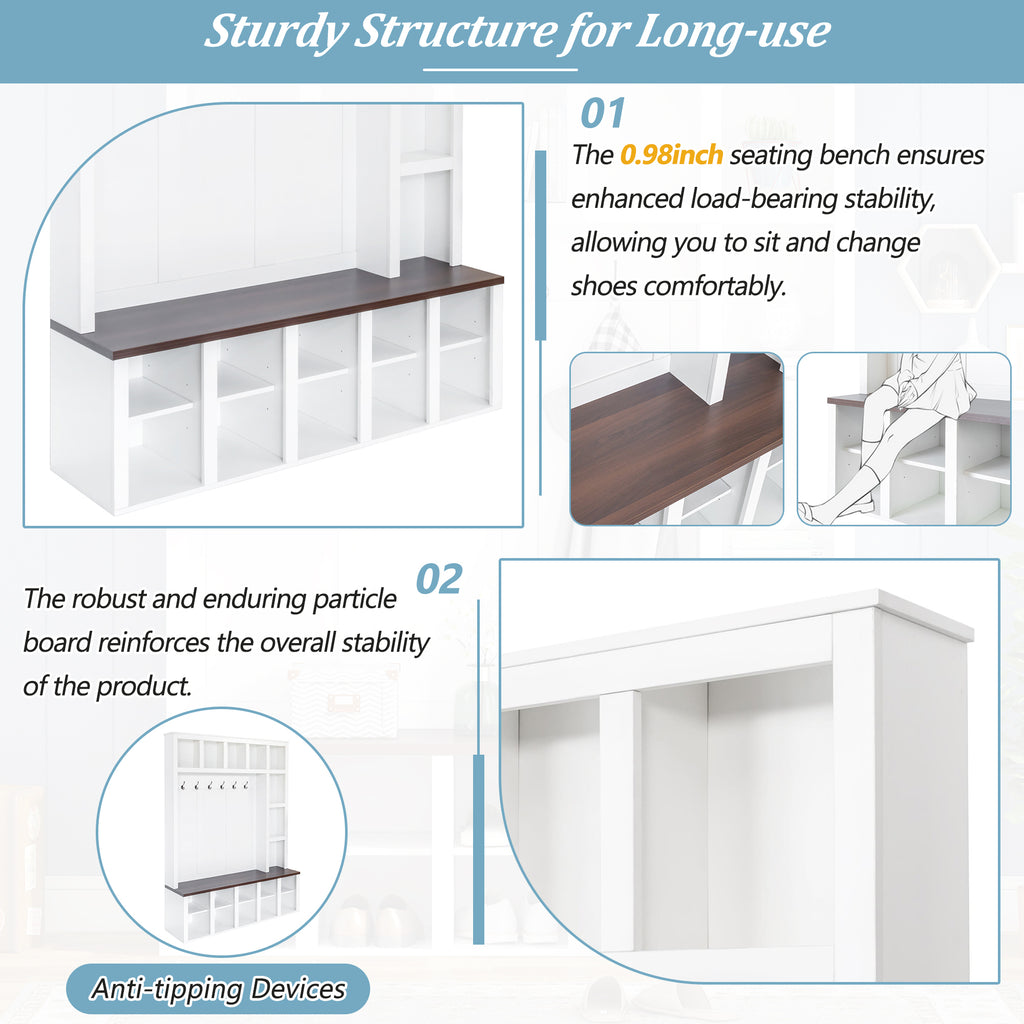 This versatile hall tree cleverly integrates a coat rack, shoe cabinet, sitting bench, and display shelves into a single design, making it an ideal solution for addressing storage needs. No matter where it’s placed, this all-in-one piece keeps your belongings neatly organized and within arm's reach!