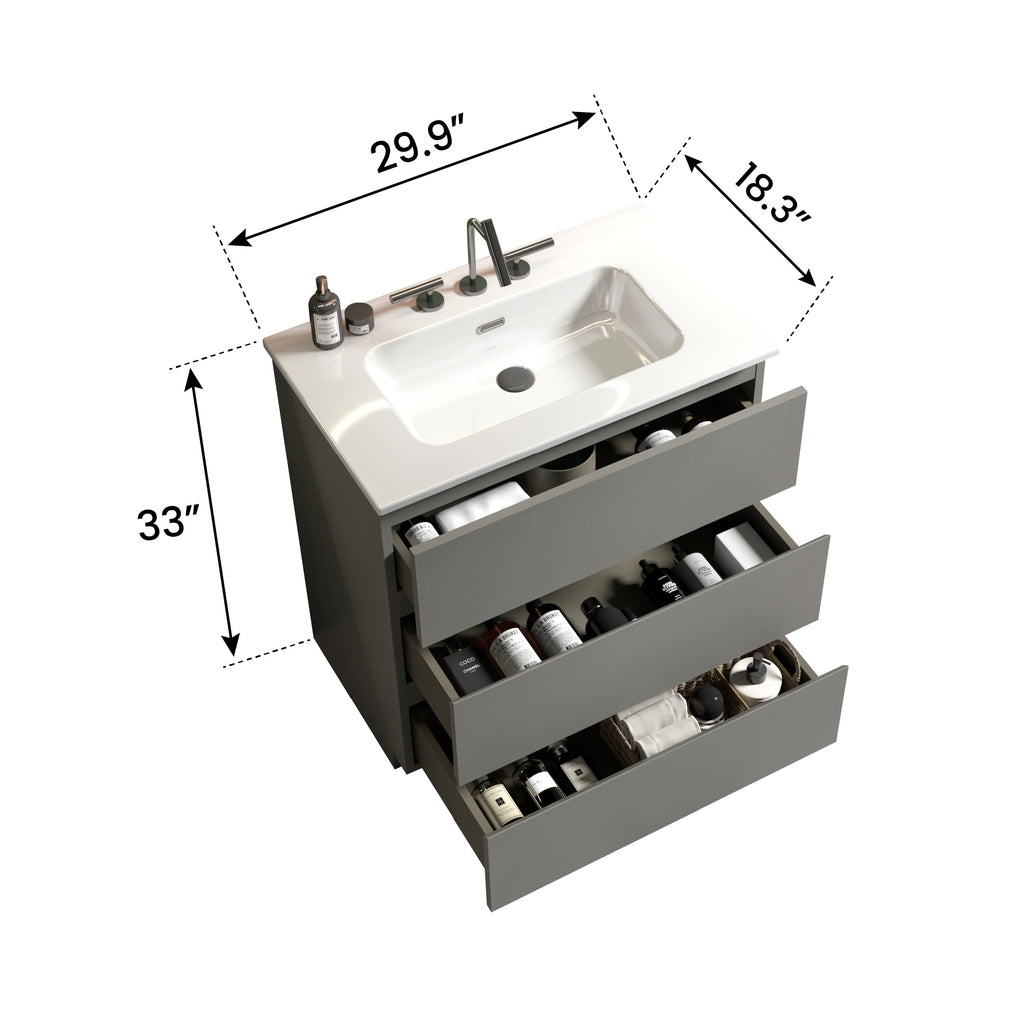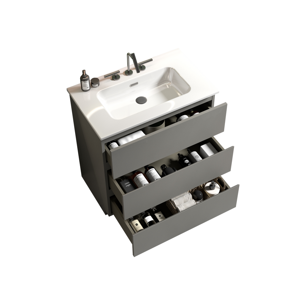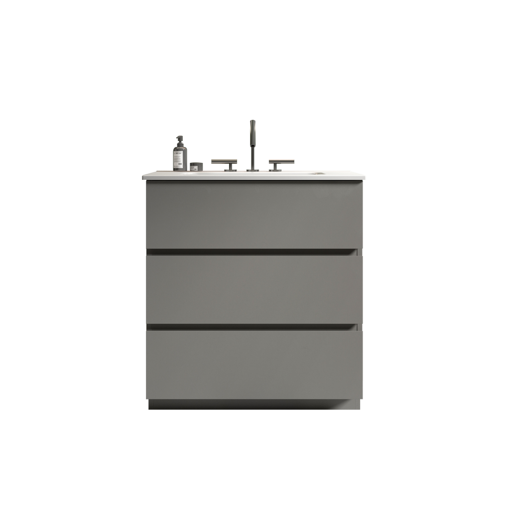 Step into a world of contemporary sophistication with Tia , This Space greysingle freestanding bathroom vanity that will transform your bathroom into a luxurious oasis. With its sleek gray finish and glossy white engineered stone basin, Alice exudes a timeless charm that effortlessly blends style and functionality.