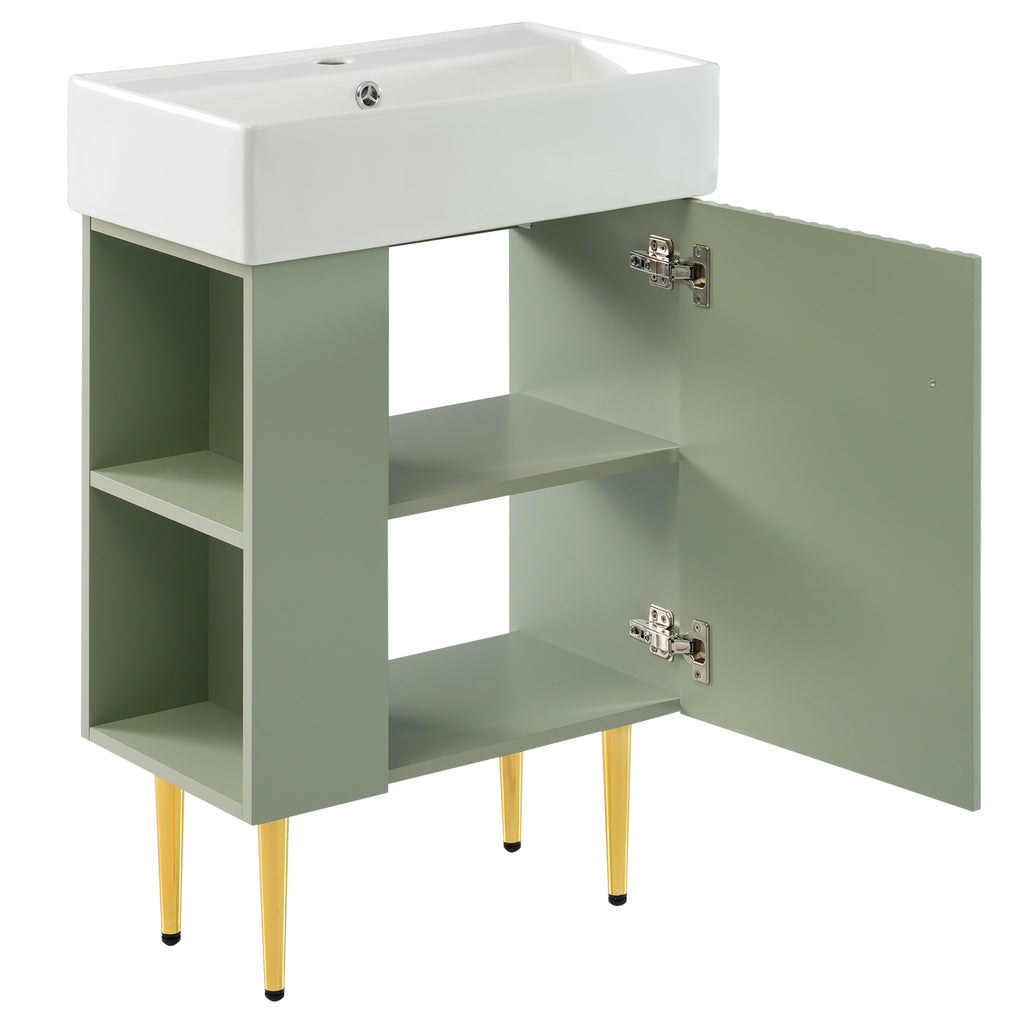 From its rectangle Ceramic top to its contemporary style hand-painted cabinet door, this single bathroom vanity is sure to brighten up your bathroom. Crafted from solid and MDF, this piece features a Ceramic top for a modern look and a clean-lined silhouette. A rectangle under-mount sink gives you a convenient place to wash your hands, while a single-door cabinet with shelf stores all your bathroom essentials. And there is a Side storage cabinet for you to place toilet paper and other supplies.In addition, the elegant golden handles, tapered legs make this bathroom vanity achieve the perfect balance of form and function.