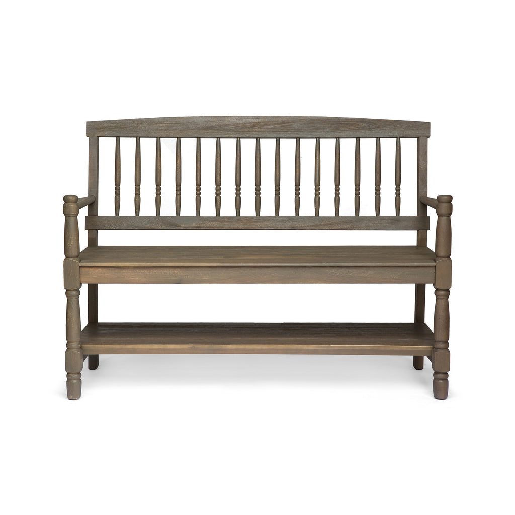 - Classic and timeless, this farmhouse Bench with a built-in shelf will not only add beauty to your home, but also act as a practical, understated means of storing previously cluttered possessions. With delicately carved Acacia wood details and a Sturdy frame, this piece is a gorgeous Sight to behold