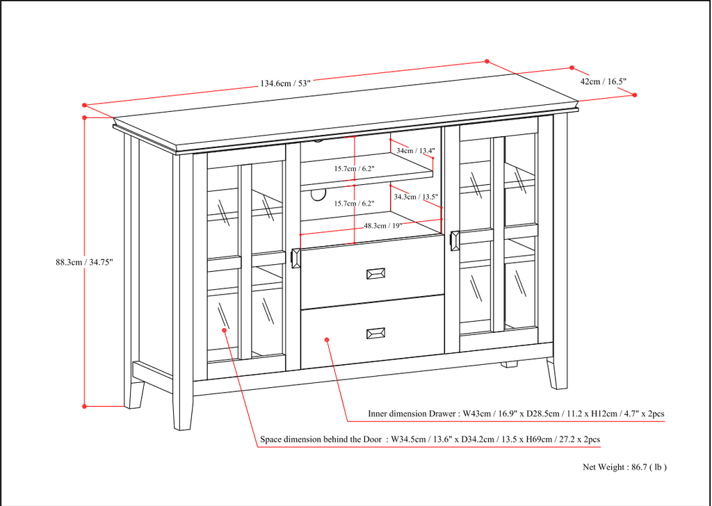 - Features two (2) central drawers with metal glides, open center area with adjustable shelf and two (2) side tempered glass framed doors that open to large storage spaces with two (2) shelves each