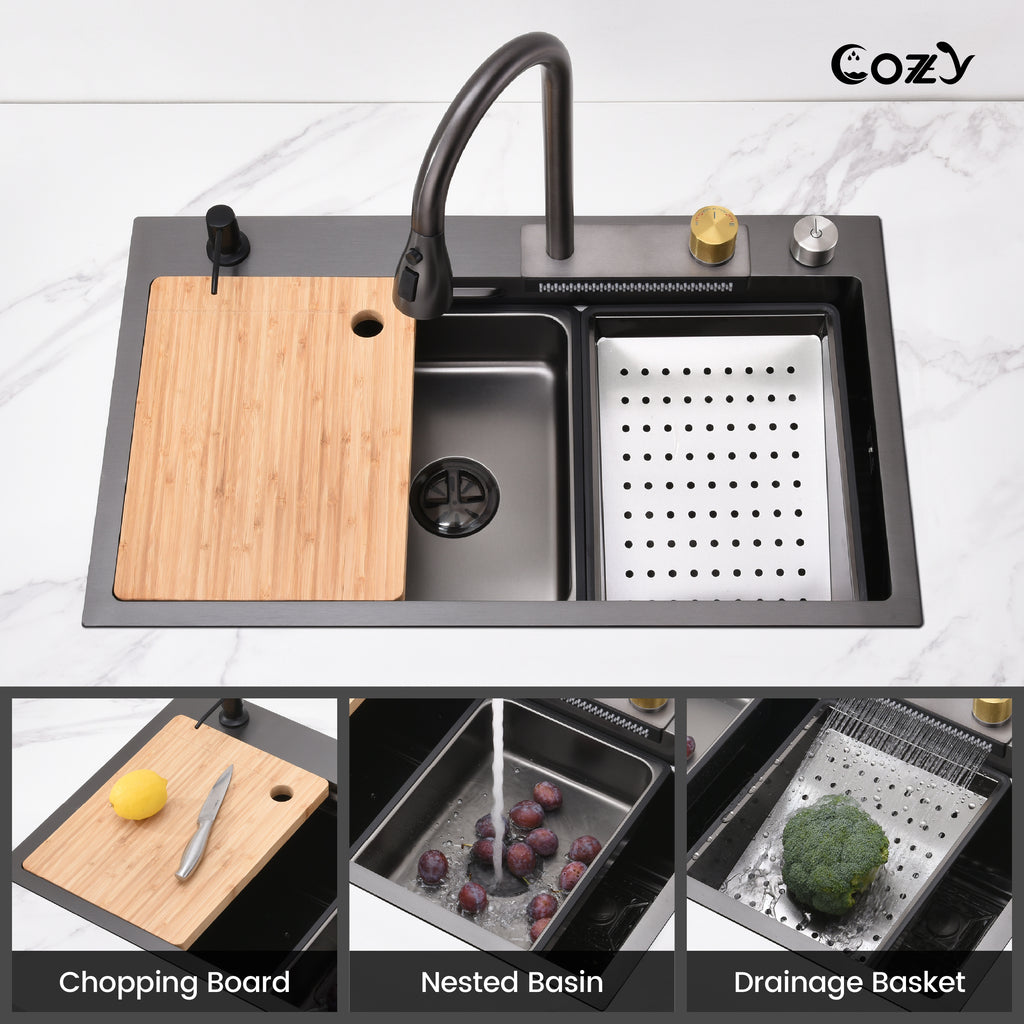 Included Components: Drainage Basket, Drain, Cutting Board, Nested Basin, Soap Dispenser, Drainage control knob