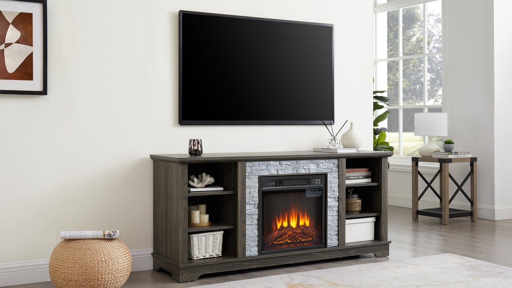 TV Stand Dimensions: 58.31'W*15.39'D*26.06'H Largest TV Size: 65'' Body Color: Grey Material: MDF + PB Number of Cable Management Cutouts: 6 Number of Adjustable Shelfs: 4 Fireplace Power Rating: 1,400 W / 4,777 BTU Temperature Setting: 62℉to 82℉ Fireplace Timer Setting: 30 minutes – 6 hours Flame Brightness Levels: 3