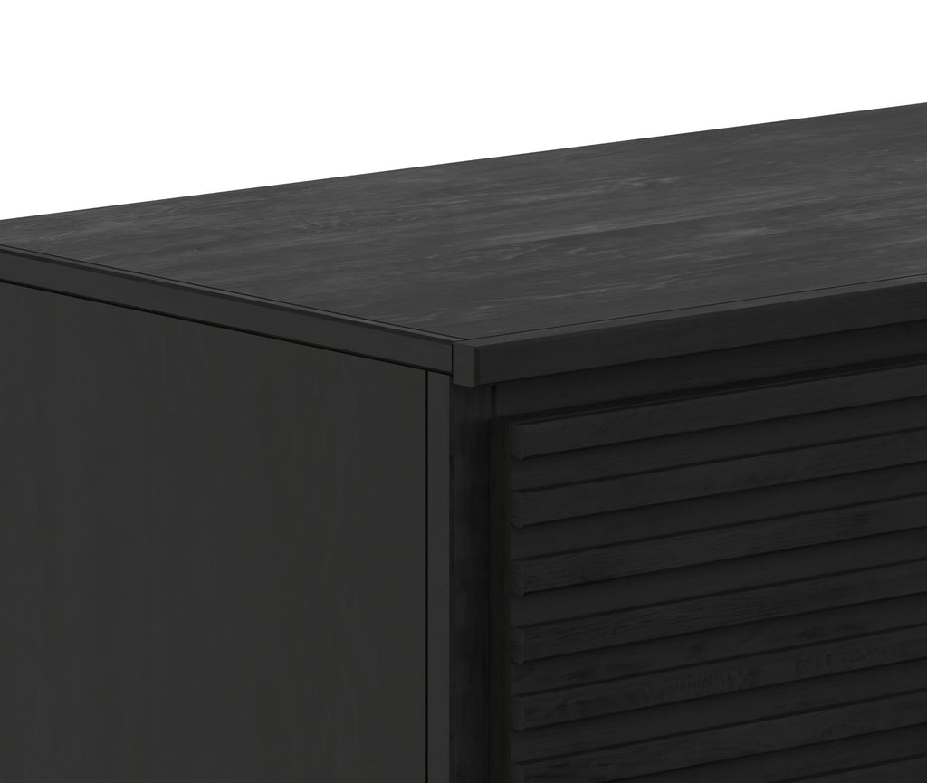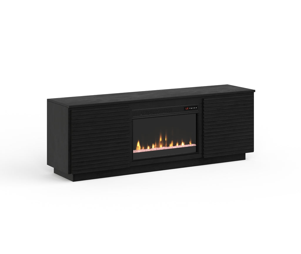 Bring home this 73 inch Fireplace TV Stand for a sophisticated and upscale addition to your living room or great room. Artfully crafted from Poplar Solids and Okume Veneers in a Black finish, this showstopping Electric Fireplace TV Console boasts clean lines and chic modern style. Featuring two doors, two shelves and cable management openings on the back panel, this Fireplace Entertainment Center will accommodate TVs up to 85 inches and provide ample storage for media and gaming consoles. The 26” Electric Fireplace Insert includes a remote control and multiple settings allow for heat up to 400 square feet. Four (included) screws make securing the fireplace insert to the console quick and simple.