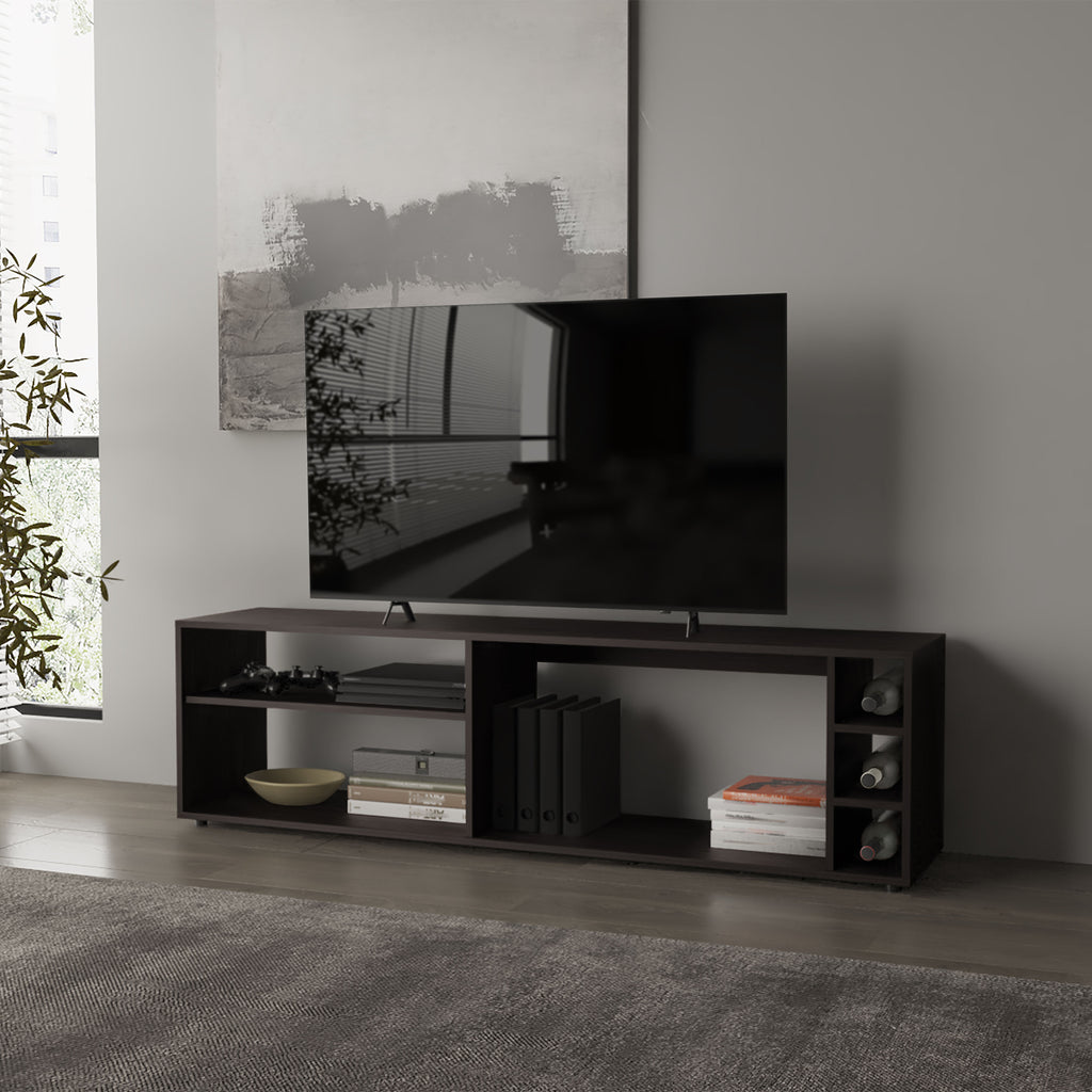 'TV Stand with Open Shelves and Side Storage, designed to support TVs up to 70 inches. Features spacious compartments for organizing electronic devices, decor, books, or gaming accessories, along with a dedicated section for vertical storage. Its sleek and functional design makes it a perfect addition to modern living spaces, combining style and practicality for your entertainment needs. Materials: Particle board and melamine. Dimensions: 17,9'' (H) x 63'' (W) x 13,8''(D).'''
