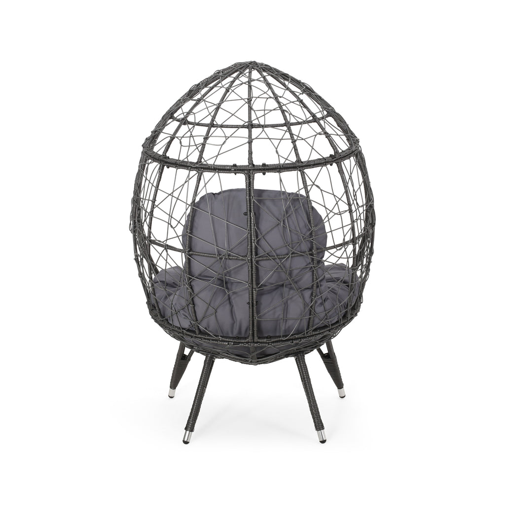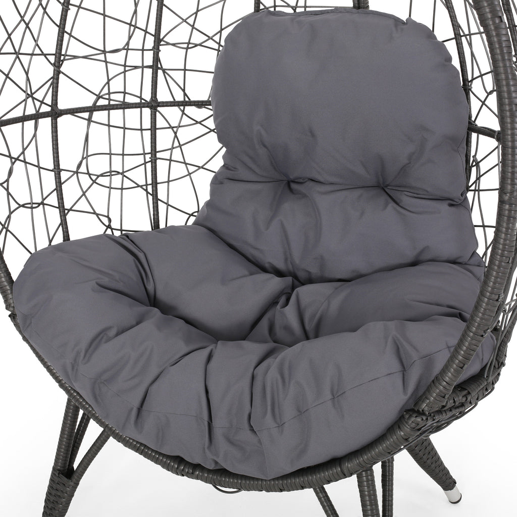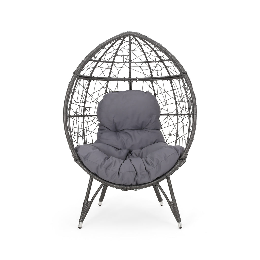 Unique style and cozy construction make this chic chair an ideal way to complete your backyard oasis. The teardrop-shaped chair features an iron frame woven with faux rattan, the abstract mesh design creating an open basket look. The seat is topped with plush, water-resistant cushions that add extra comfort to this chic chair.