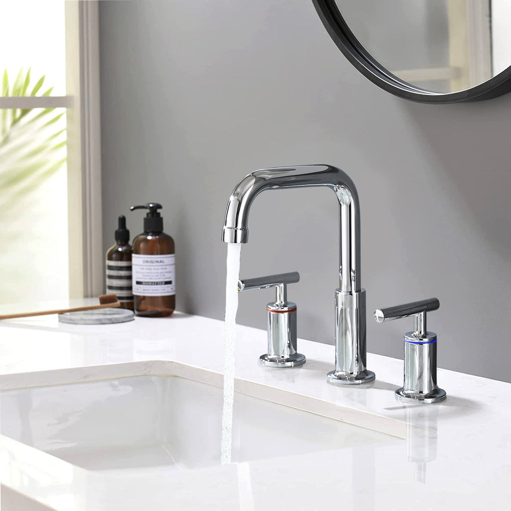 - This 8-inch faucet exemplifies an understated style, with its high gooseneck spout and lever handles. Easy-to-install and leak-free valves provide reliable performance and durability. And the spout features laminar flow, which helps conserve water while preventing splashing.