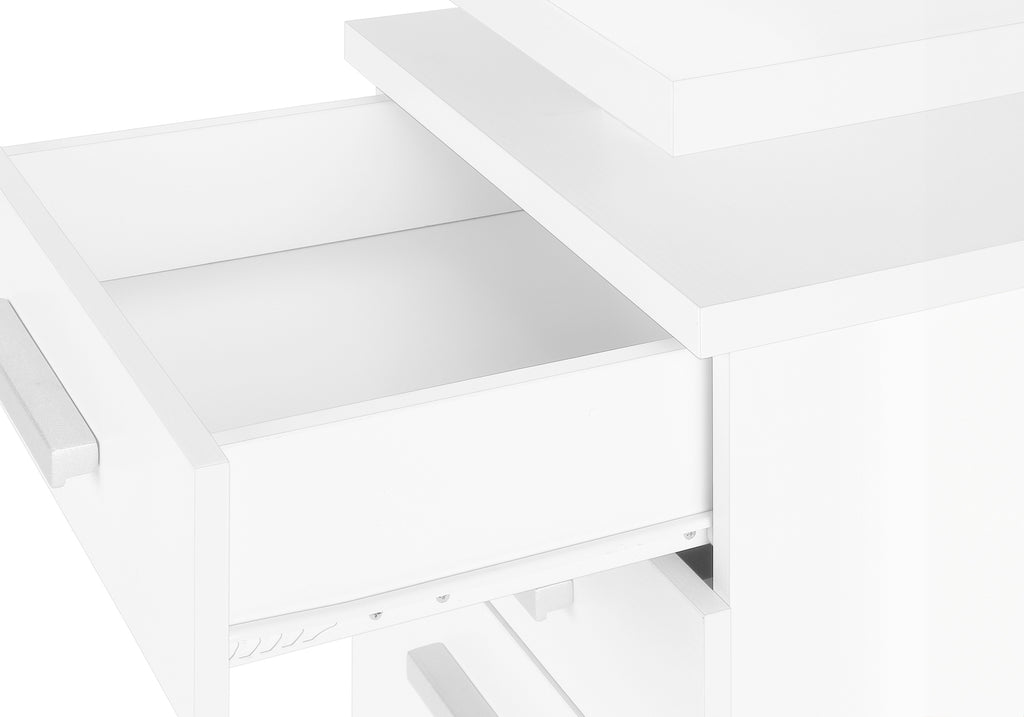 - 2-inch-thick, rectangular wooden leg in a white finish and metal drawer handles in a complementary silver finish