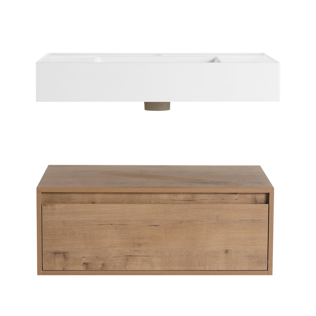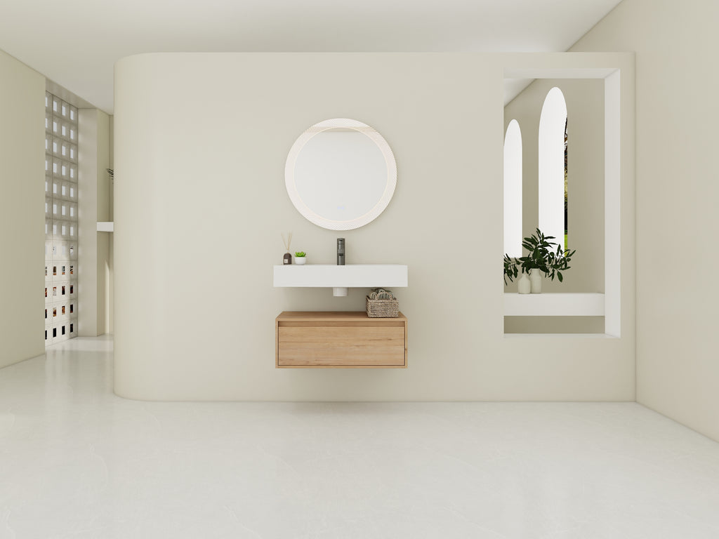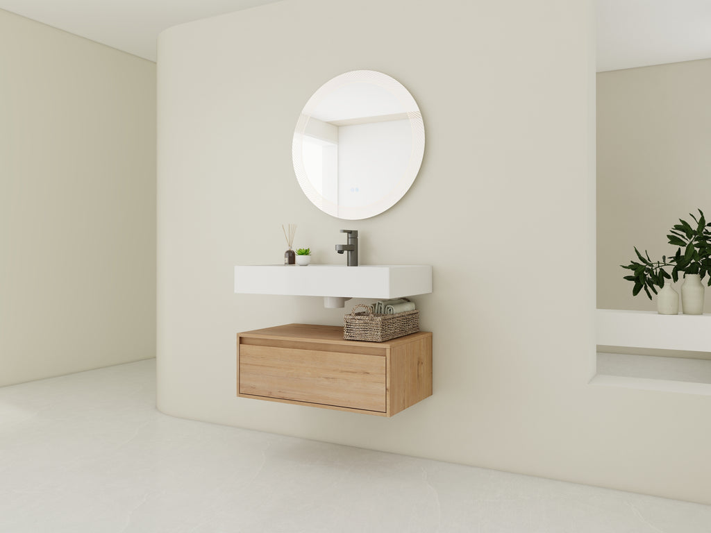 Our bathroom dresser adopts a wall-mounted design, perfectly blending modern minimalist style with natural beauty, adding a touch of freshness and elegance to your bathroom space. The main color is Imitative Oak, featuring a warm hue and natural texture that easily blends into modern home decors, showcasing taste and elegance.