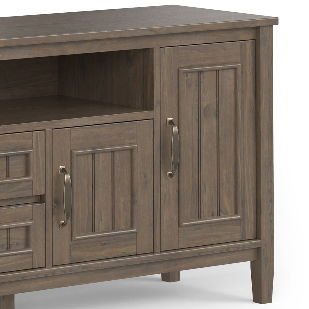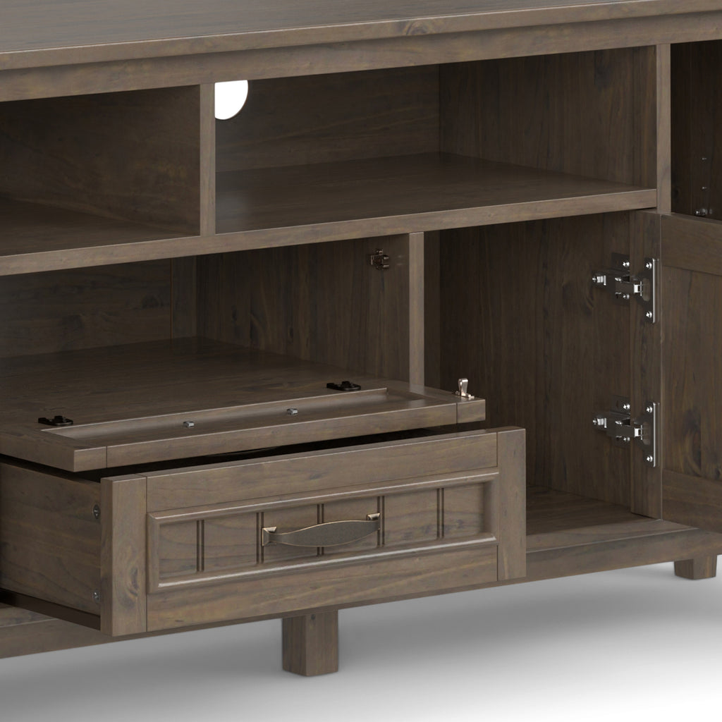 - Features a large centrally located open area with one (1) flip down drawer, one (1) pull out drawer as well as two (2) framed doors with enclosed spaces; the two (2) large side storage cabinets open to one adjustable shelf each.