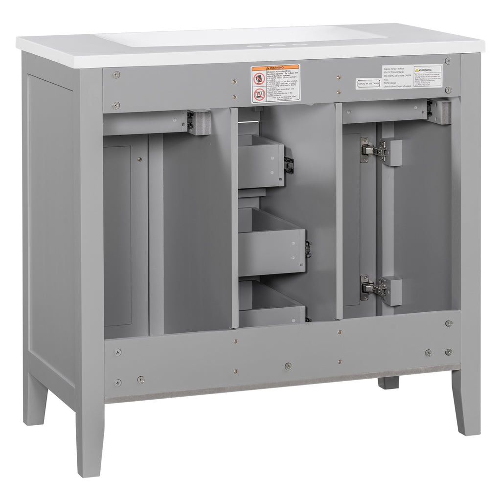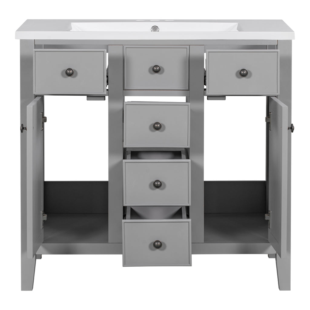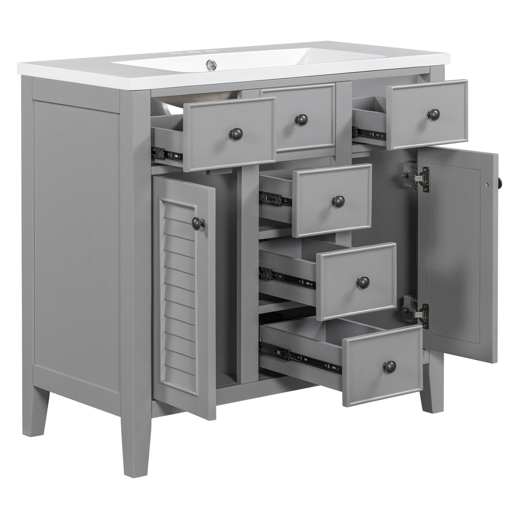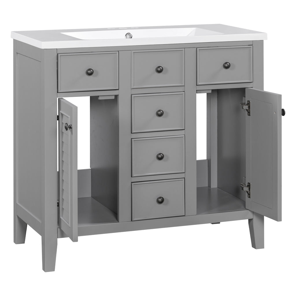 - Ample Storage Space: This bathroom basin cabinet has five drawers and two cabinets. Two larger drawers are located below the basin, and in the middle is a decorative fake drawer that cannot be opened. Three small drawers are arranged vertically under the decorative ones. On either side of the three small drawers are two cabinets, each with a louvered door. These five drawers and two cabinets can be used as storage.