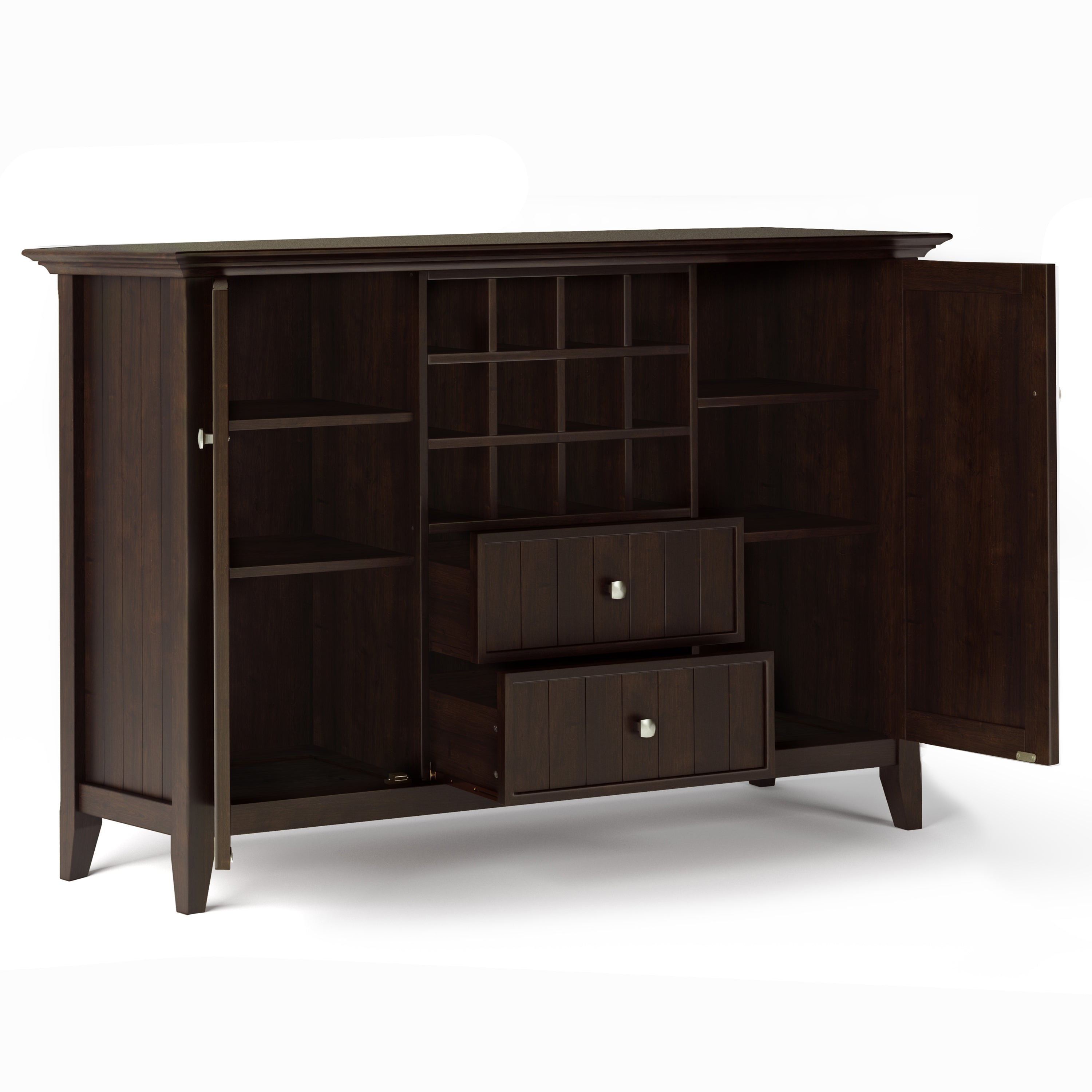 - Features two (2) central drawers with metal glides, two (2) side doors that open to large storage spaces with two (2) shelves each and a twelve (12) bottle wine storage rack.