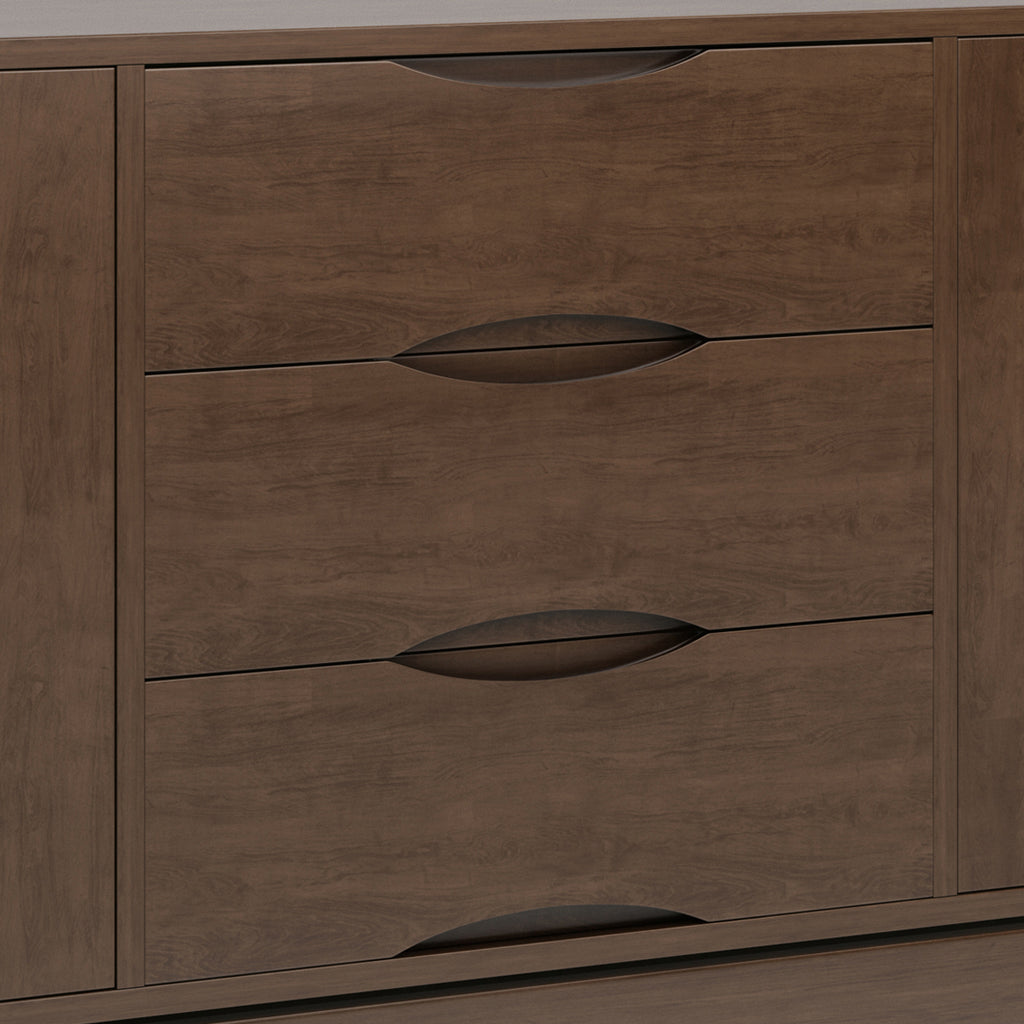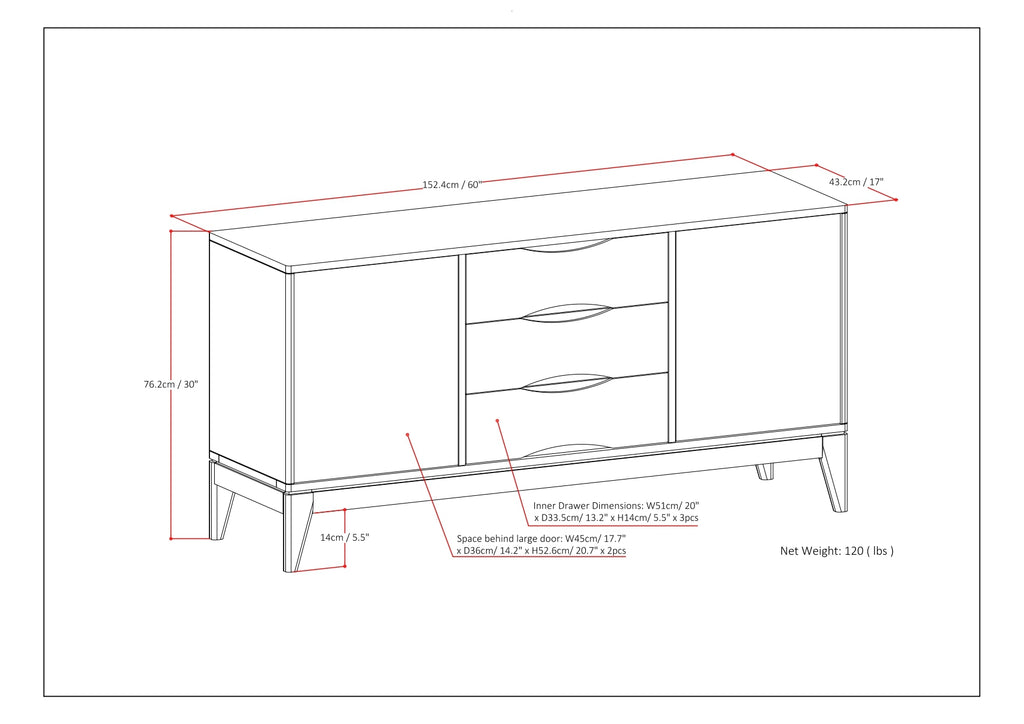 - Features three (3 )central drawers with metal glides, and two (2) sidedoors that open to large storage spaces with one (1) adjustable shelf each.