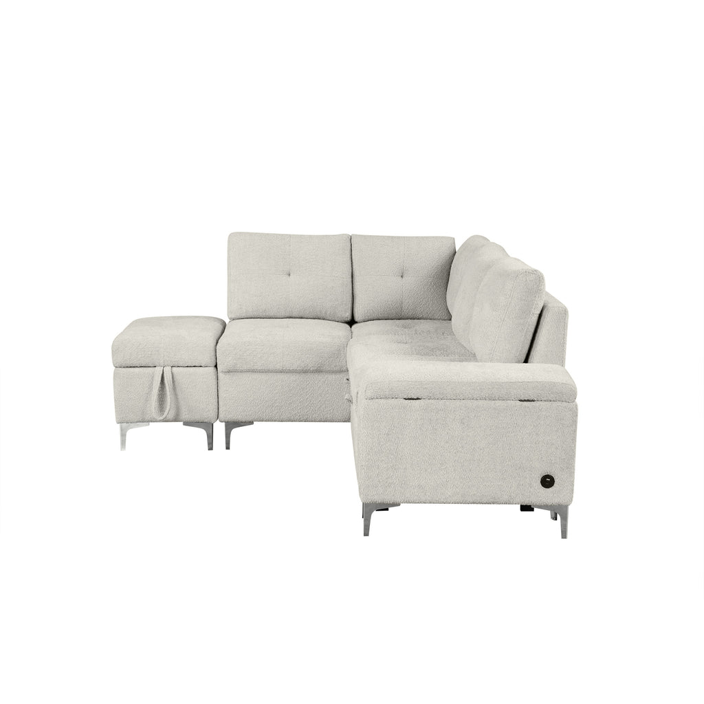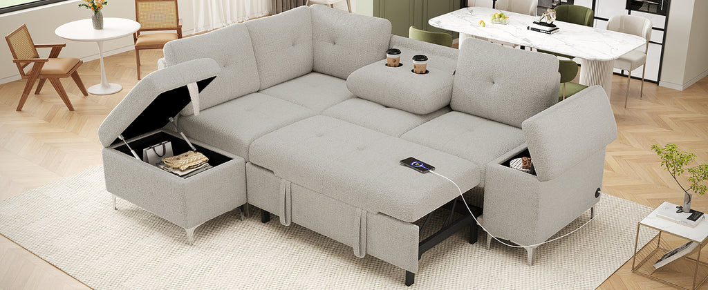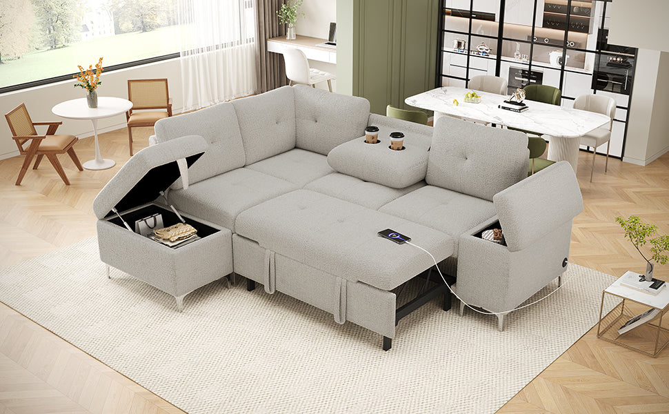 This versatile sectional sofa bed combines style, comfort, and functionality for any living space. Its innovative design allows you to easily transform it from an L-shaped configuration into a sofa bed, offering multiple seating options to suit your needs. Built-in storage solutions, including a storage ottoman and a side compartment, provide convenient hidden space for blankets, pillows, and everyday essentials. The sofa also features a drop-down backrest that converts into a coffee table with two cup holders, adding practicality and style. With two handy USB ports for device charging and premium materials like chenille fabric, high-density foam, and pocket springs, this sofa delivers luxurious comfort and long-lasting durability. Its sleek metal legs complete the modern look, making it a perfect addition to any home.