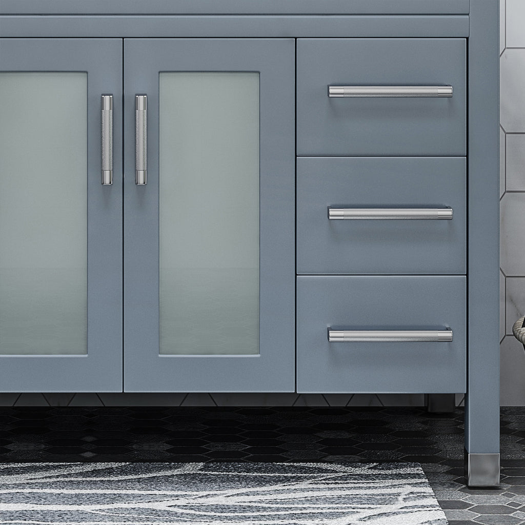 - 48” VANITY WITH GLASS PANEL CABINETS: This vanity is perfect for those who love to personalize their furniture. The length of this piece provides generous room for sink and extra counter space. This also includes a soft-close, double-door cabinet in the middle of the vanity, featuring frosted glass paneling on each door.