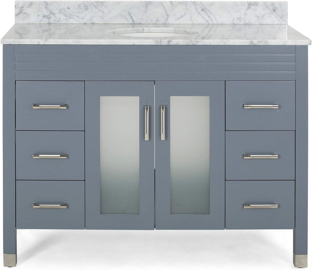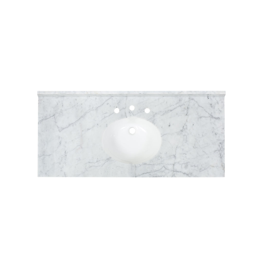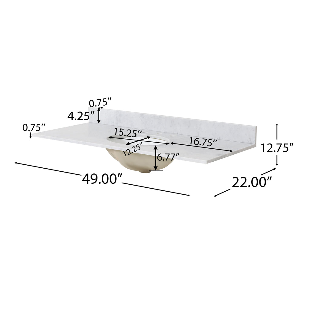 - ITALIAN CARRARA WHITE MARBLE TOP: This vanity comes with an Italian Carrara white marble top which is one inch wider than the base. Please check dimensions for further details. The shape, color, and density of the veining are natural to stone countertops and will vary from slab to slab. This top includes a backsplash, an undermount porcelain sink, and cutouts for faucets of your choice (faucets are not included).