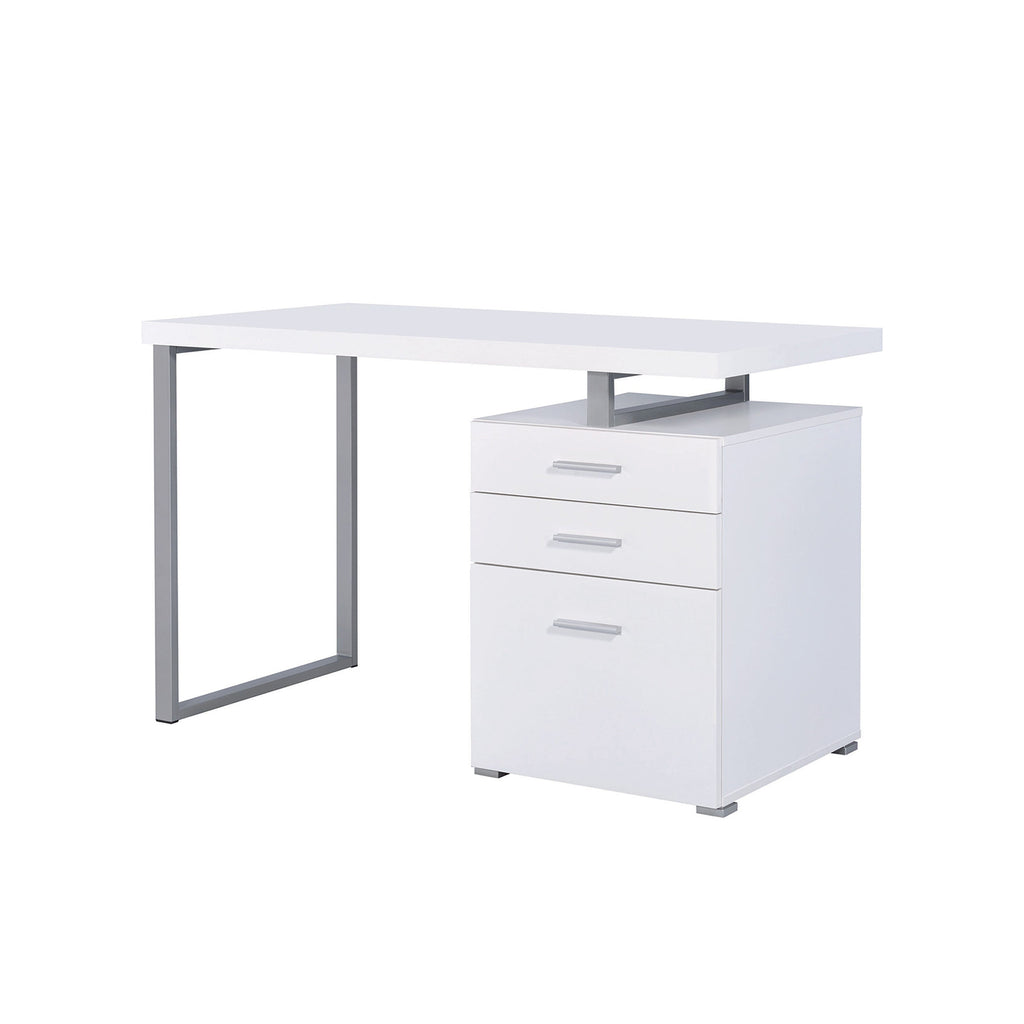 Update your home office with contemporary glamour. This office desk boasts a chic, trendy silhouette. A sturdy metal frame with a cool silver finish elegantly complements its sleek design. Three convenient drawers include a large file cabinet with space for both legal and letter size documents. It is crafted from particle board, metal and hollow board, high quality materials ensure its stability and finish in white and chrome make it look fantastic.