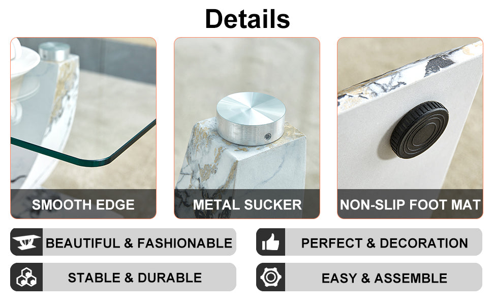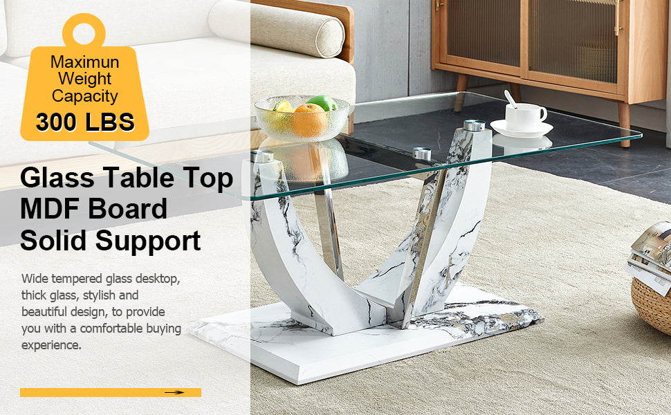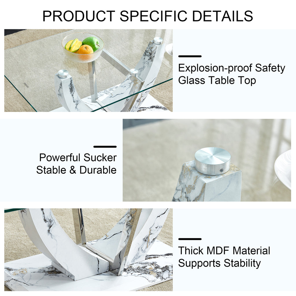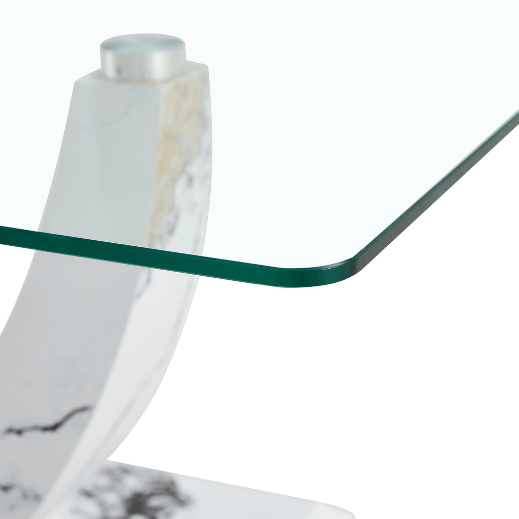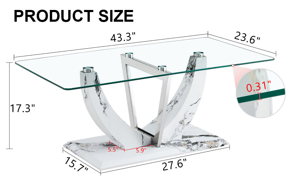 - Modern minimalist and transparent tempered glass coffee table, paired with marble patterned stainless steel decorative pillars. Computer desk. Game table.