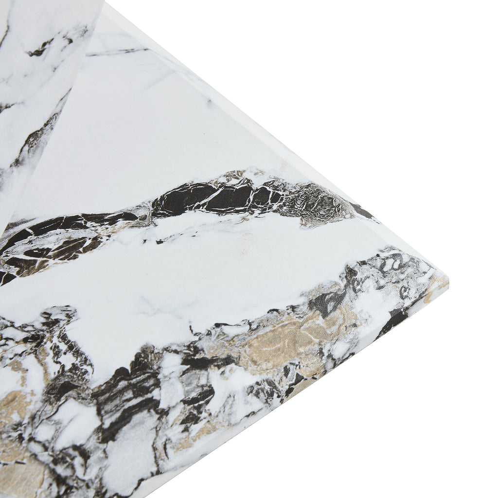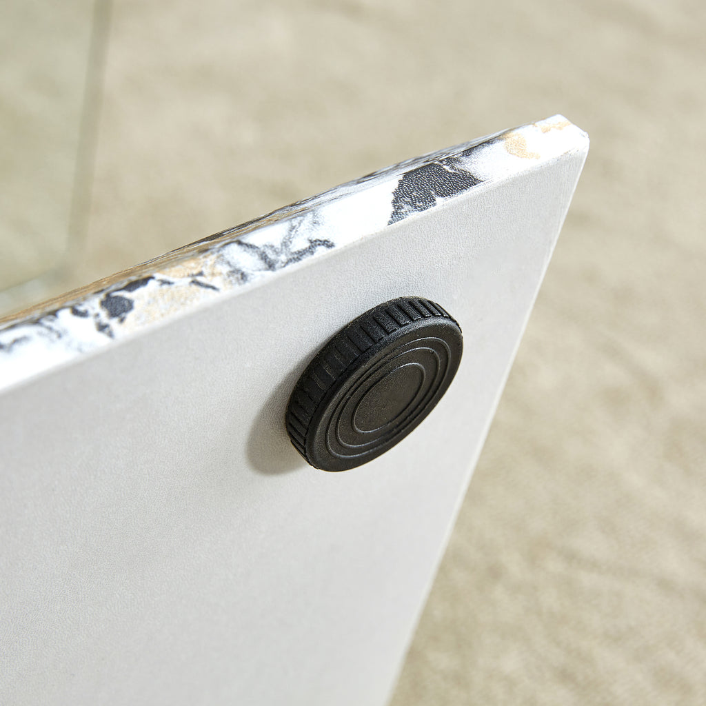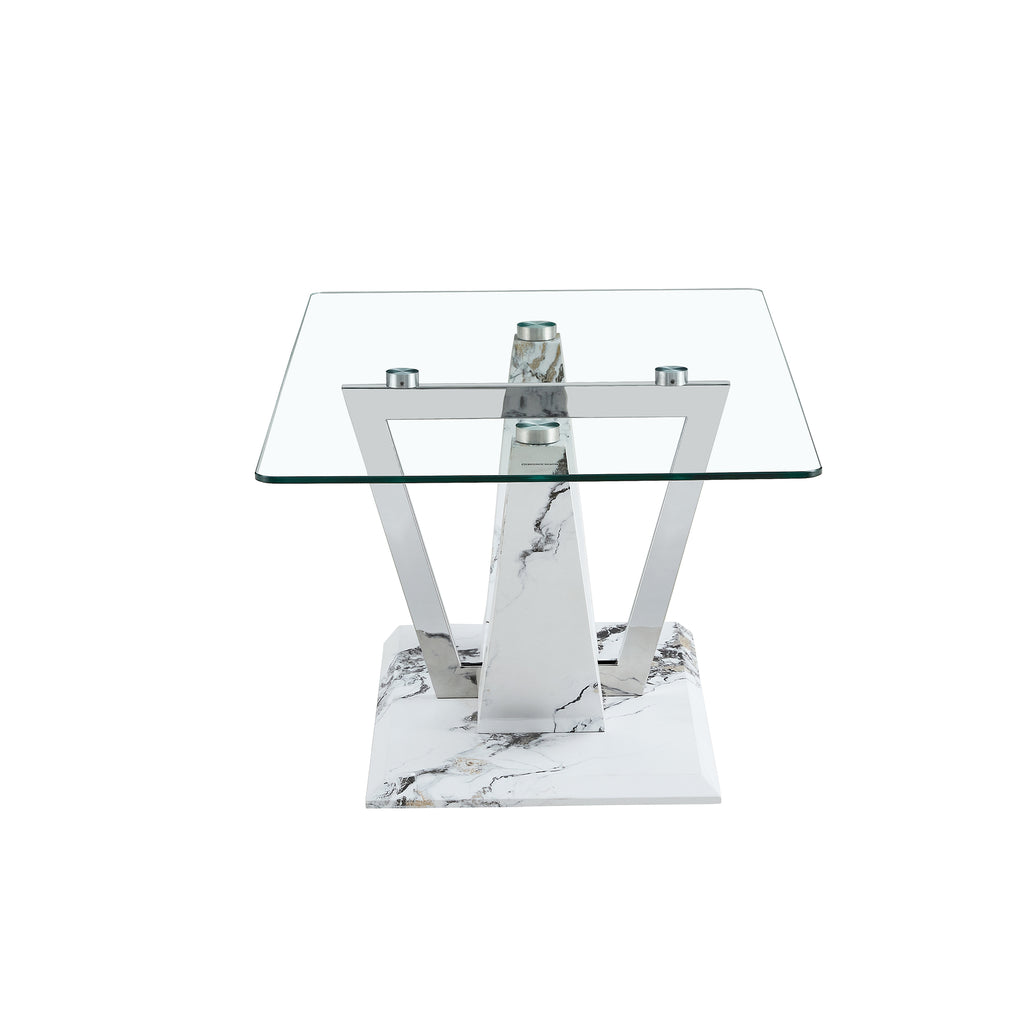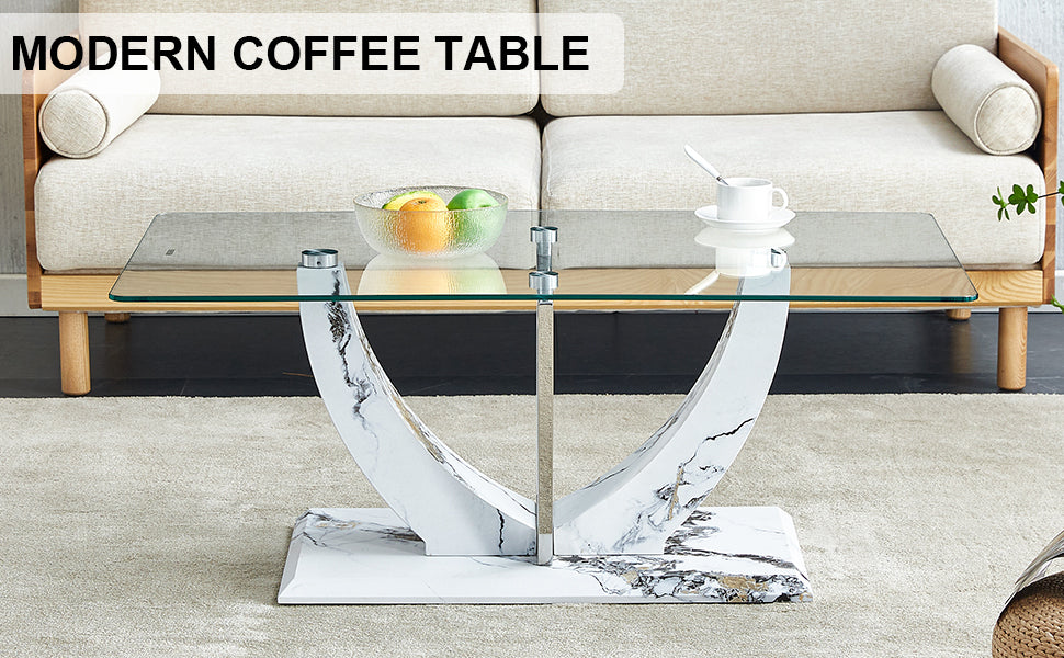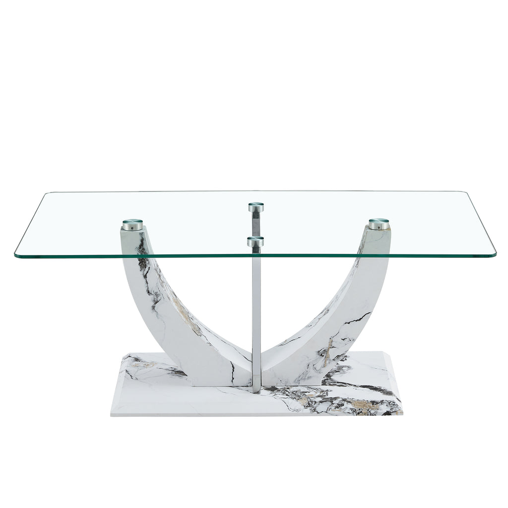 - Modern minimalist and transparent tempered glass coffee table, paired with marble patterned stainless steel decorative pillars. Computer desk. Game table.