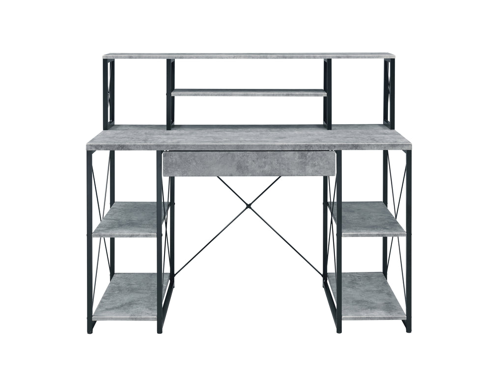 - The desk features a spacious drawer with smooth side metal glides and eight open compartments, including two fixed top shelves and four fixed base shelves, providing ample storage for organization.